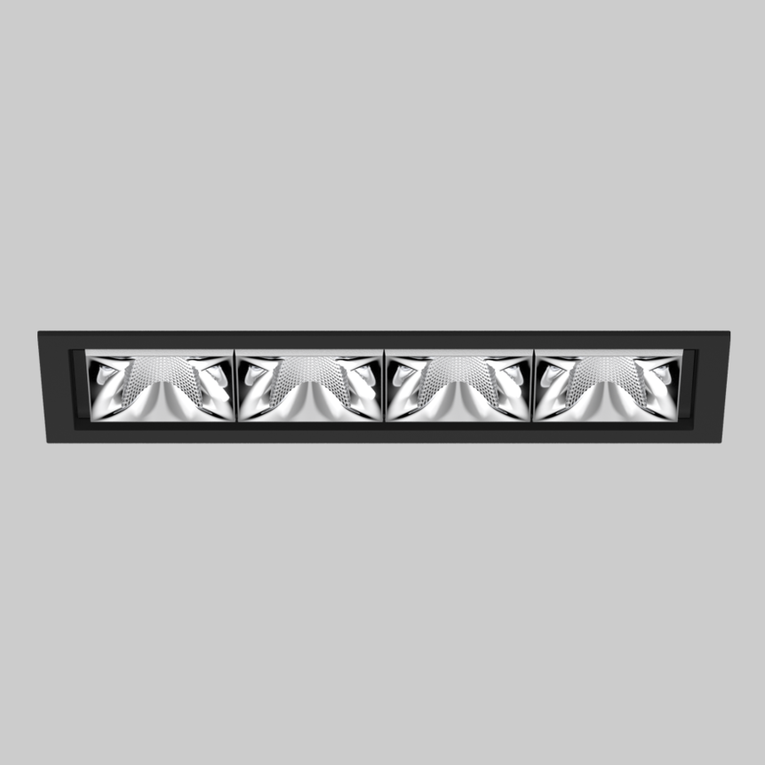 Multi-Downlight rectangulaire en aluminium moulé sous pression pour encastrement ; montage sans outils en kit de montage grâce à un système breveté de loquet à billes ; boîtier à encastrer rectangulaire ; avec bord continu noir profond ; approprié pour une épaisseur de plafond de 2-25 mm ; équipé de quatre optiques flood round ; répartition symétrique de la lumière avec caractéristique d'émission précise, angle de rayonnement 49° ; réflecteur de haute qualité avec surface à micro-facettes vaporisée d'aluminium ; réflecteur chromé ; UGR ≤ 16 ; luminaire d'éclairage de poste de travail adapté au travail sur écran selon DIN EN 12464-1 ; luminance supérieure à 65° ≤ 3000 cd / m² ; refroidissement passif des LED par géométrie optimisée du radiateur ; couleur de lumière 4000 K ; binning initialement MacAdam ≤ 3 SDCM ; CRI ≥ 90 ; min. 90 % du flux lumineux au bout de 50000 h de durée de vie ; High-Power-LED à grande efficacité énergétique, très bon rendu des couleurs ; indice de protection IP20 ; CP2 ; 220-240 V ; convertisseur DALI-2 inclus ; boîtier de raccordement pour câblage ultérieur, 3 ou 5 bornes, disponible comme accessoire ; accessoires présentés séparément ; source lumineuse non remplaçable ; dispositif de commande remplaçable par un professionnel agréé ; sans distorsions ;