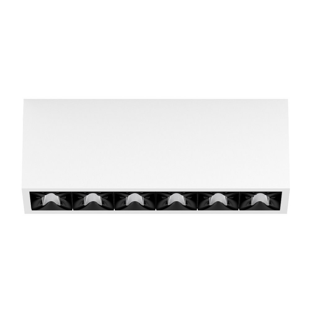 Multi-downlight apparent rectangulaire, en aluminium ; corps de luminaire pouvant être monté sans outils sur la plaque de montage grâce à un système de verrouillage ; convertisseur intégré dans le corps de luminaire ; surface thermolaquée blanc signalisation ; équipé de six optiques medium round ; répartition symétrique de la lumière avec caractéristique d'émission précise, angle de rayonnement 33° ; réflecteur de haute qualité avec surface à micro-facettes vaporisée d'aluminium ; Réflecteur noir ; UGR ≤ 10 ; refroidissement passif des LED par géométrie optimisée du radiateur ; couleur de lumière 3000 K ; ≤ 3 SDCM (initial MacAdam) ; CRI ≥ 90 ; min. 90 % du flux lumineux au bout de 50000 h de durée de vie ; High-Power-LED à grande efficacité énergétique, très bon rendu des couleurs ; indice de protection IP20 ; CP1 ; 220-240 V ; convertisseur inclus, non dimmable ; source lumineuse non remplaçable ; dispositif de commande remplaçable par un professionnel agréé ; sans distorsions ;