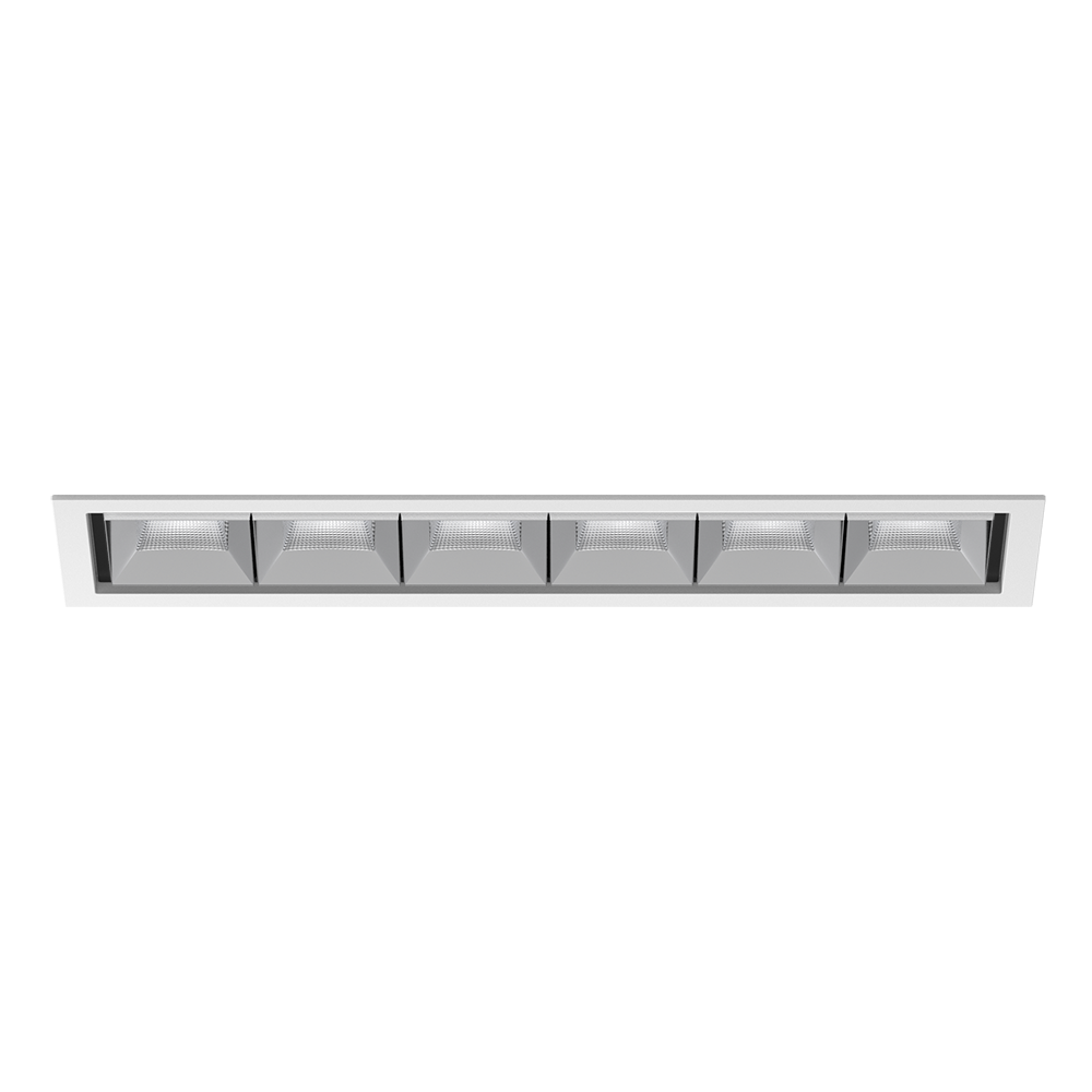 Multi-Downlight rectangulaire en aluminium moulé sous pression pour encastrement ; montage sans outils en kit de montage grâce à un système breveté de loquet à billes ; boîtier à encastrer rectangulaire ; avec bord continu blanc signalisation ; approprié pour une épaisseur de plafond de 2-25 mm ; équipé de six optiques wide flood square ; répartition symétrique de la lumière avec caractéristique d'émission précise, angle de rayonnement 71° ; réflecteur de haute qualité avec surface à micro-facettes vaporisée d'aluminium ; réflecteur chromé ; refroidissement passif des LED par géométrie optimisée du radiateur ; couleur de lumière 4000 K ; binning initialement MacAdam ≤ 3 SDCM ; CRI ≥ 90 ; min. 90 % du flux lumineux au bout de 50000 h de durée de vie ; High-Power-LED à grande efficacité énergétique, très bon rendu des couleurs ; indice de protection IP20 ; CP2 ; 220-240 V ; convertisseur inclus, non dimmable ; boîtier de raccordement pour câblage ultérieur, 3 ou 5 bornes, disponible comme accessoire ; accessoires présentés séparément ; source lumineuse non remplaçable ; dispositif de commande remplaçable par un professionnel agréé ; sans distorsions ;