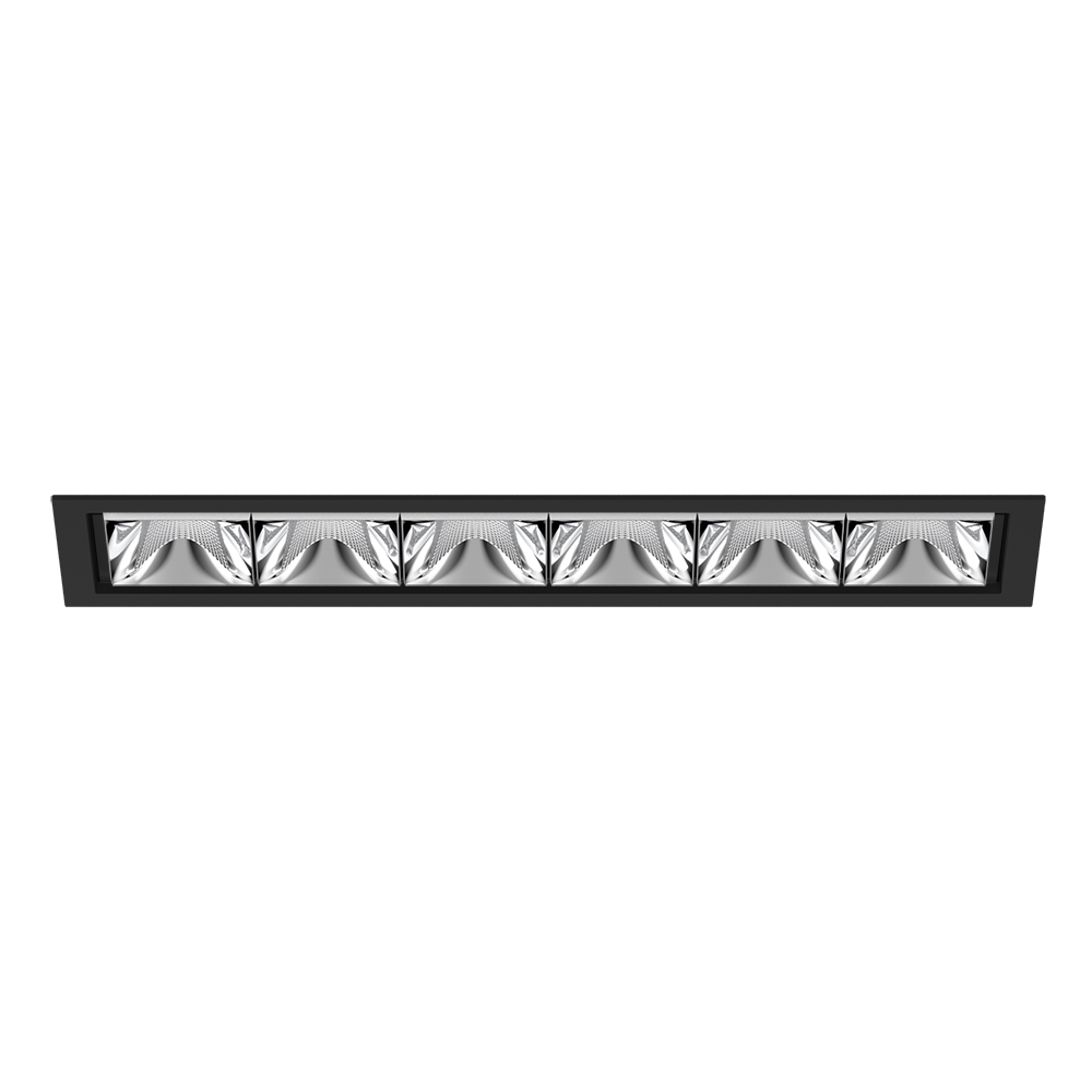 Multi-Downlight rectangulaire en aluminium moulé sous pression pour encastrement ; montage sans outils en kit de montage grâce à un système breveté de loquet à billes ; boîtier à encastrer rectangulaire ; avec bord continu noir profond ; approprié pour une épaisseur de plafond de 2-25 mm ; équipé de six optiques wide flood round ; répartition symétrique de la lumière avec caractéristique d'émission précise, angle de rayonnement 72° ; réflecteur de haute qualité avec surface à micro-facettes vaporisée d'aluminium ; réflecteur chromé ; refroidissement passif des LED par géométrie optimisée du radiateur ; couleur de lumière 2700 K ; binning initialement MacAdam ≤ 3 SDCM ; CRI ≥ 90 ; min. 90 % du flux lumineux au bout de 50000 h de durée de vie ; High-Power-LED à grande efficacité énergétique, très bon rendu des couleurs ; indice de protection IP20 ; CP2 ; 220-240 V ; convertisseur inclus, non dimmable ; boîtier de raccordement pour câblage ultérieur, 3 ou 5 bornes, disponible comme accessoire ; accessoires présentés séparément ; source lumineuse non remplaçable ; dispositif de commande remplaçable par un professionnel agréé ; sans distorsions ;