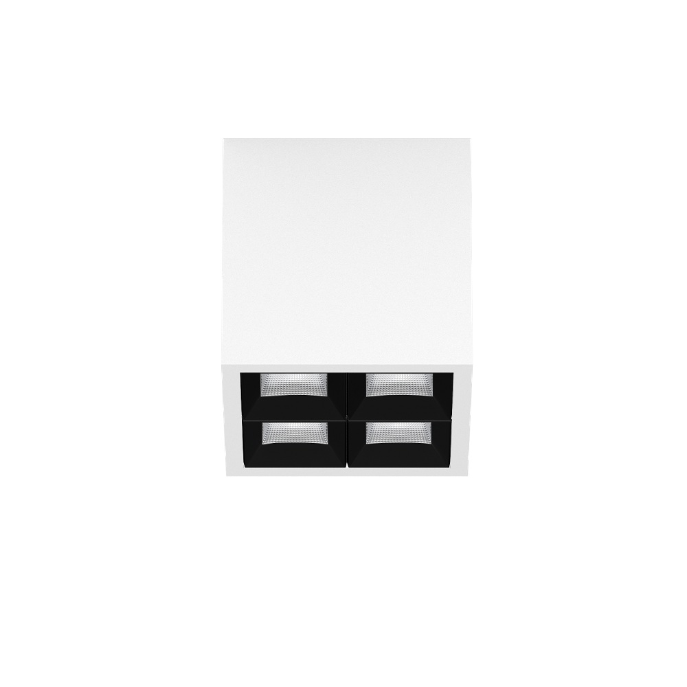 Multi-downlight apparent carré, en aluminium ; corps de luminaire pouvant être monté sans outils sur la plaque de montage grâce à un système de verrouillage ; convertisseur intégré dans le corps de luminaire ; surface thermolaquée blanc signalisation ; équipé de quatre optiques wide flood square ; répartition symétrique de la lumière avec caractéristique d'émission précise, angle de rayonnement 71° ; réflecteur de haute qualité avec surface à micro-facettes vaporisée d'aluminium ; Réflecteur noir ; refroidissement passif des LED par géométrie optimisée du radiateur ; couleur de lumière 4000 K ; ≤ 3 SDCM (initial MacAdam) ; CRI ≥ 90 ; min. 90 % du flux lumineux au bout de 50000 h de durée de vie ; High-Power-LED à grande efficacité énergétique, très bon rendu des couleurs ; indice de protection IP20 ; CP1 ; 220-240 V ; convertisseur DALI-2 inclus ; source lumineuse non remplaçable ; dispositif de commande remplaçable par un professionnel agréé ; sans distorsions ;