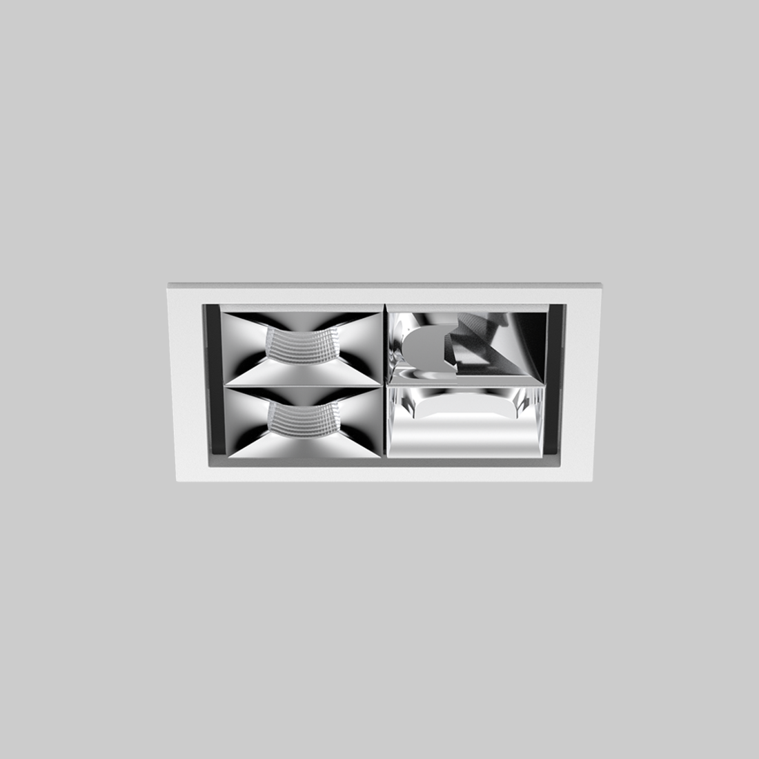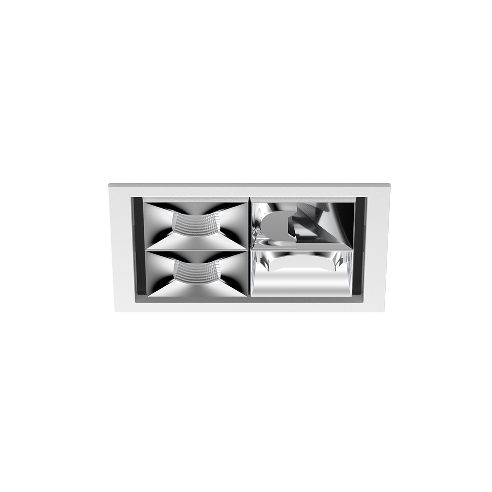 Multi-Downlight carré en aluminium moulé sous pression pour encastrement ; montage sans outils en kit de montage grâce à un système breveté de loquet à billes ; boîtier à encastrer carré ; avec bord continu blanc signalisation ; approprié pour une épaisseur de plafond de 2-25 mm ; équipé d'un système optique wallwasher 90° + un système optique wallwasher 0° + deux systèmes optiques medium square ; caractéristique de rayonnement précise ; réflecteur de haute qualité avec surface à micro-facettes vaporisée d'aluminium ; réflecteur chromé ; refroidissement passif des LED par géométrie optimisée du radiateur ; couleur de lumière 4000 K ; ≤ 3 SDCM (initial MacAdam) ; CRI ≥ 90 ; min. 90 % du flux lumineux au bout de 50000 h de durée de vie ; High-Power-LED à grande efficacité énergétique, très bon rendu des couleurs ; indice de protection IP20 ; CP2 ; convertisseur DALI-2 inclus ; boîtier de raccordement pour câblage ultérieur, 3 ou 5 bornes, disponible comme accessoire ; accessoires présentés séparément ; source lumineuse non remplaçable ; dispositif de commande remplaçable par un professionnel agréé ; sans distorsions ;