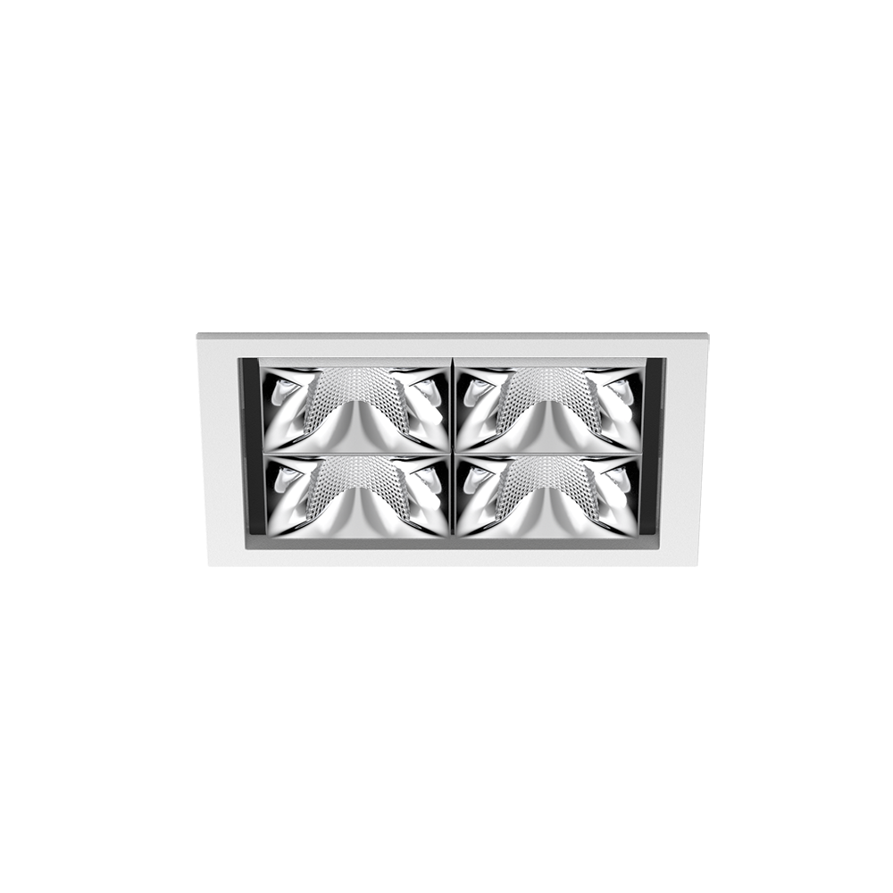 Multi-Downlight carré en aluminium moulé sous pression pour encastrement ; montage sans outils en kit de montage grâce à un système breveté de loquet à billes ; boîtier à encastrer carré ; avec bord continu blanc signalisation ; approprié pour une épaisseur de plafond de 2-25 mm ; équipé de quatre optiques flood round ; répartition symétrique de la lumière avec caractéristique d'émission précise, angle de rayonnement 49° ; réflecteur de haute qualité avec surface à micro-facettes vaporisée d'aluminium ; réflecteur chromé ; UGR ≤ 16 ; luminaire d'éclairage de poste de travail adapté au travail sur écran selon DIN EN 12464-1 ; luminance supérieure à 65° ≤ 3000 cd / m² ; refroidissement passif des LED par géométrie optimisée du radiateur ; couleur de lumière 2700 K ; binning initialement MacAdam ≤ 3 SDCM ; CRI ≥ 90 ; min. 90 % du flux lumineux au bout de 50000 h de durée de vie ; High-Power-LED à grande efficacité énergétique, très bon rendu des couleurs ; indice de protection IP20 ; CP2 ; convertisseur inclus, non dimmable ; boîtier de raccordement pour câblage ultérieur, 3 ou 5 bornes, disponible comme accessoire ; accessoires présentés séparément ; source lumineuse non remplaçable ; dispositif de commande remplaçable par un professionnel agréé ; sans distorsions ;