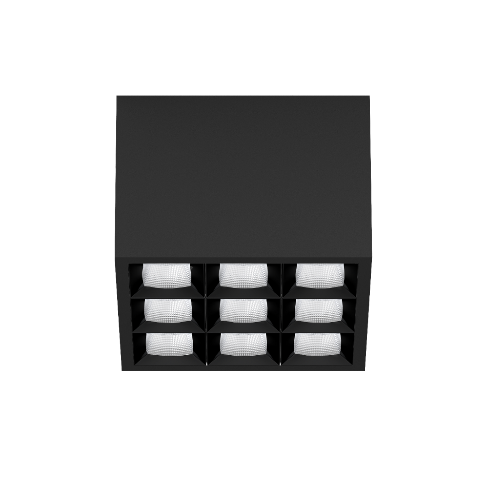 Multi-downlight apparent carré, en aluminium ; corps de luminaire pouvant être monté sans outils sur la plaque de montage grâce à un système de verrouillage ; convertisseur intégré dans le corps de luminaire ; surface thermolaquée noir profond ; équipé de neuf optiques flood square ; répartition symétrique de la lumière avec caractéristique d'émission précise, angle de rayonnement 56° ; réflecteur de haute qualité avec surface à micro-facettes vaporisée d'aluminium ; Réflecteur noir ; UGR ≤ 19 ; luminaire d'éclairage de poste de travail adapté au travail sur écran selon DIN EN 12464-1 ; luminance supérieure à 65° ≤ 3000 cd / m² ; refroidissement passif des LED par géométrie optimisée du radiateur ; couleur de lumière 2700 K ; ≤ 3 SDCM (initial MacAdam) ; CRI ≥ 90 ; min. 90 % du flux lumineux au bout de 50000 h de durée de vie ; High-Power-LED à grande efficacité énergétique, très bon rendu des couleurs ; indice de protection IP20 ; CP1 ; 220-240 V ; convertisseur DALI-2 inclus ; source lumineuse non remplaçable ; dispositif de commande remplaçable par un professionnel agréé ; sans distorsions ;
