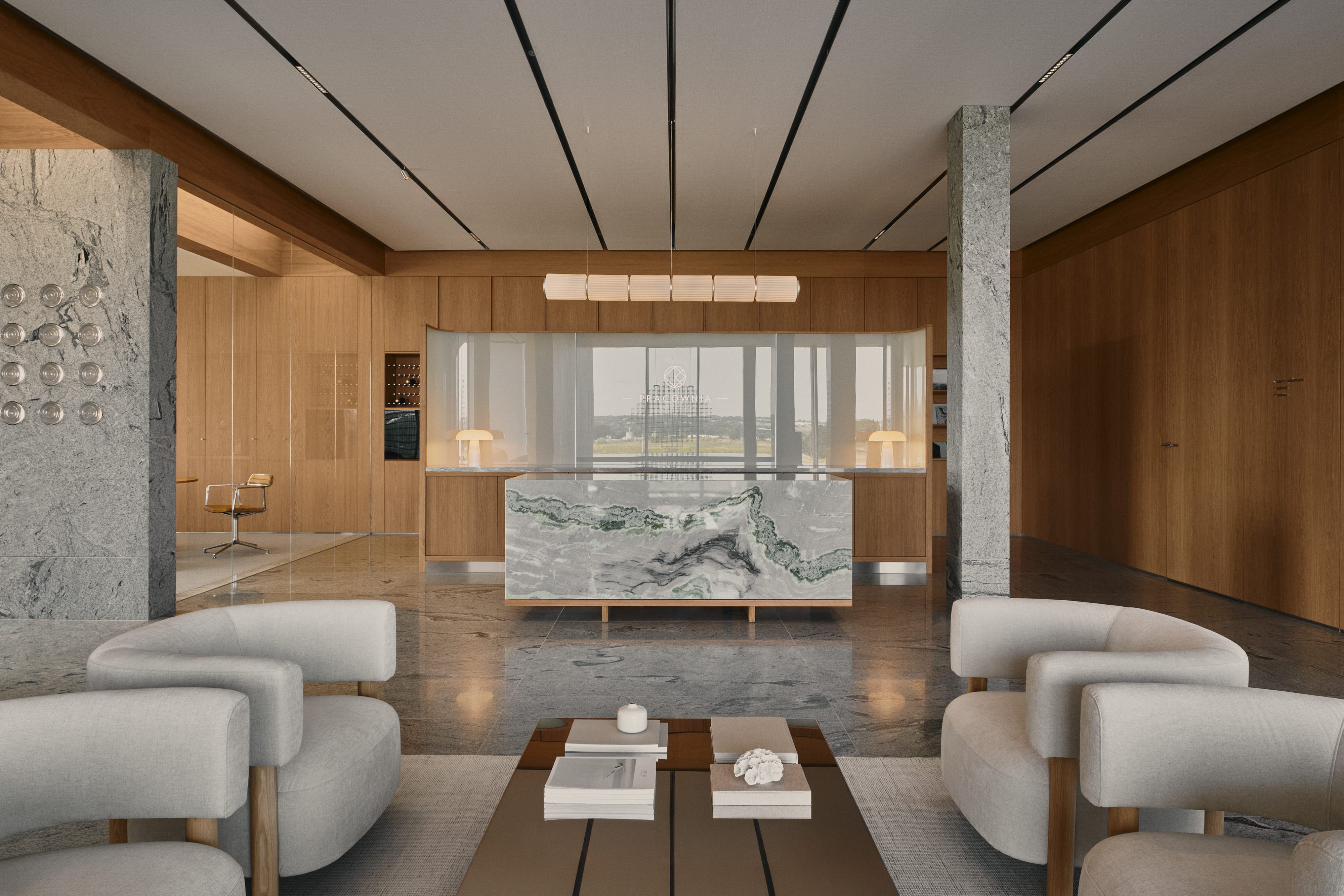 Gli architetti hanno lavorato con la bellezza naturale del legno, del sasso e del metallo armonizzando questi materiali con tessuti naturali, tappeti ed elementi in vetro. Hanno ideato soluzioni su misura, come rivestimenti murari sviluppati ad hoc, vele di tessuto amovibili per i soffitti e un’illuminazione architettonica in alluminio grezzo che sottolineasse il concetto minimalista dei materiali e il carattere di autenticità del progetto. La precisa implementazione tecnica rende la luce parte integrante dell’architettura.