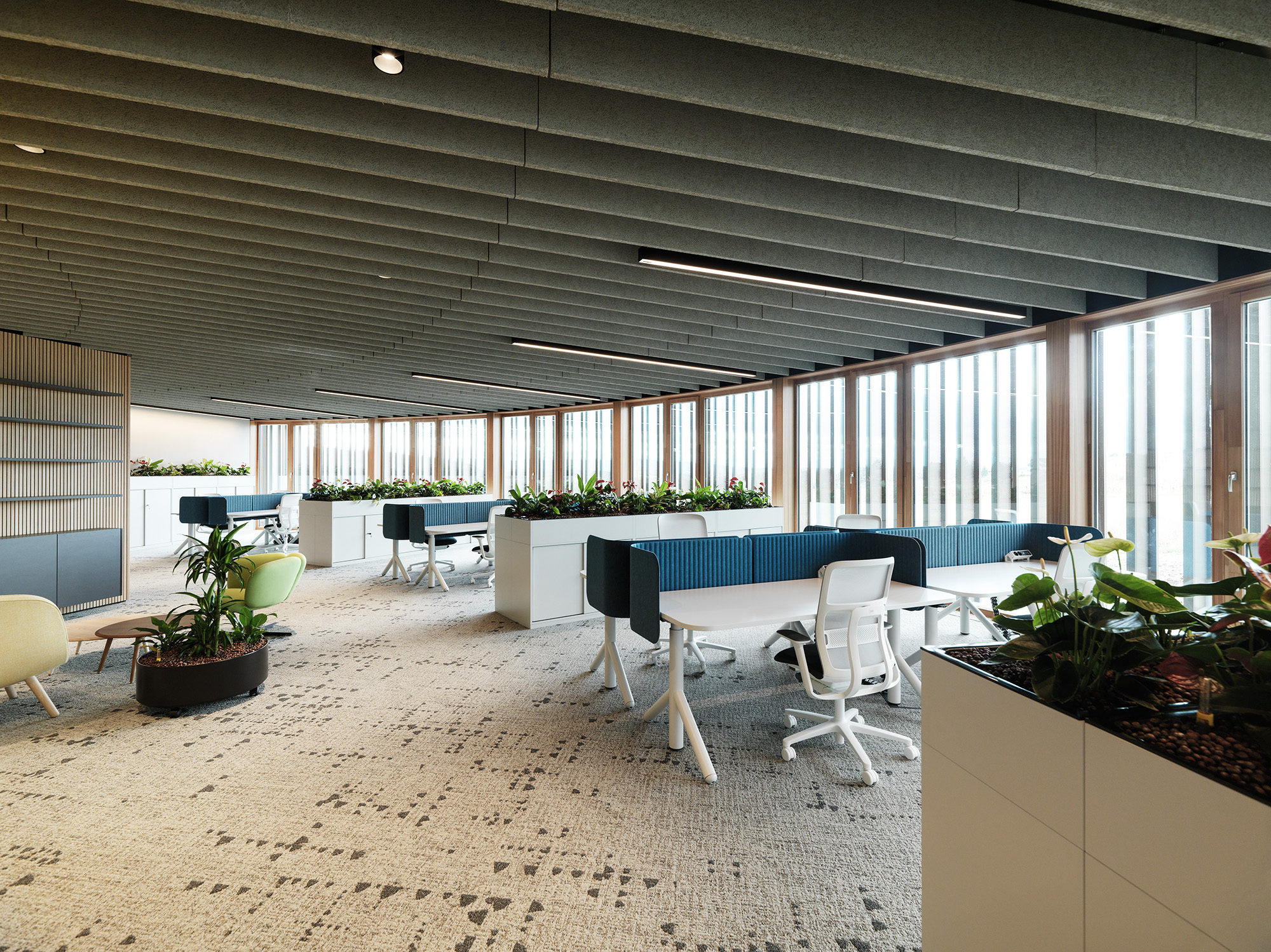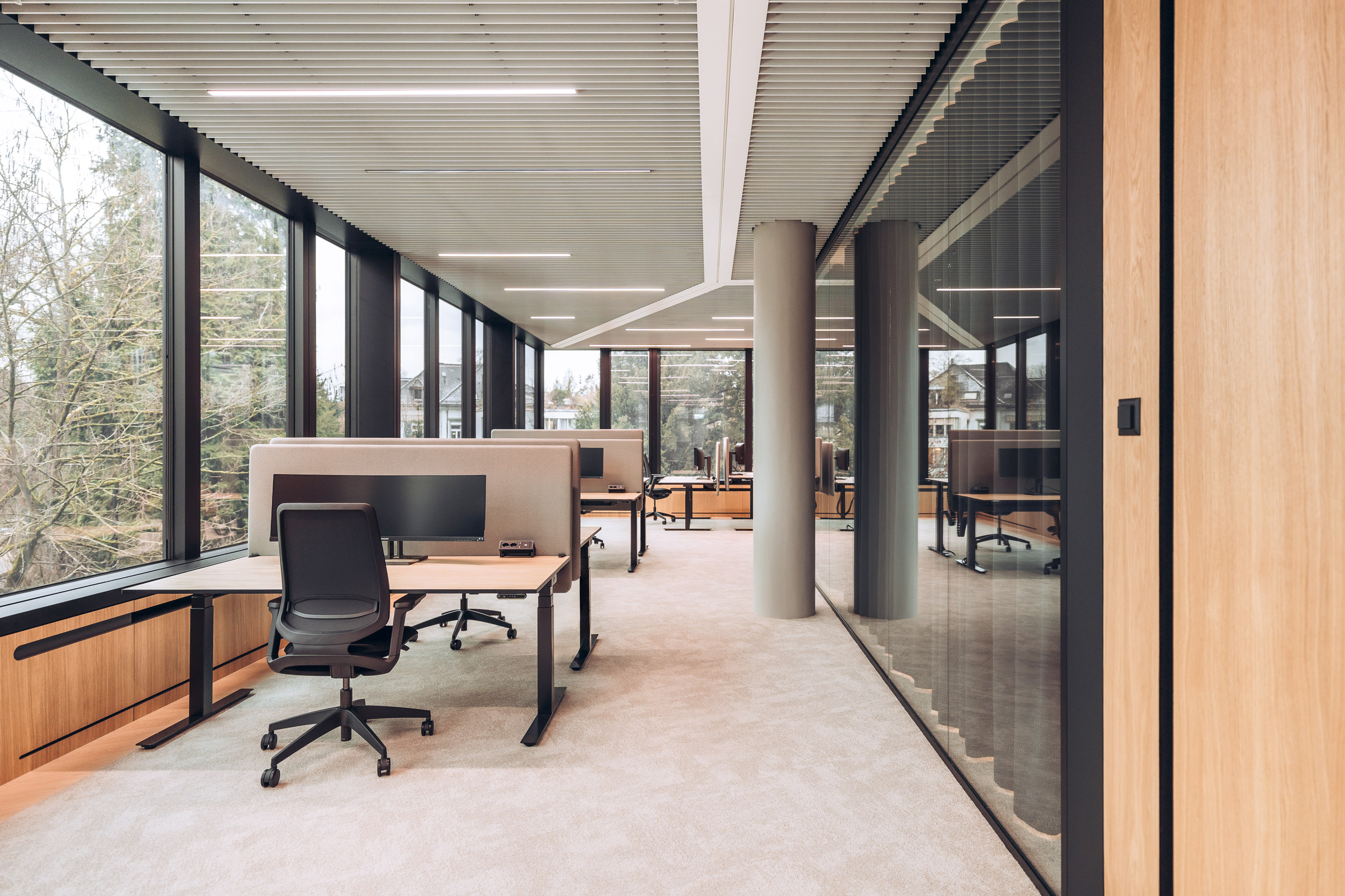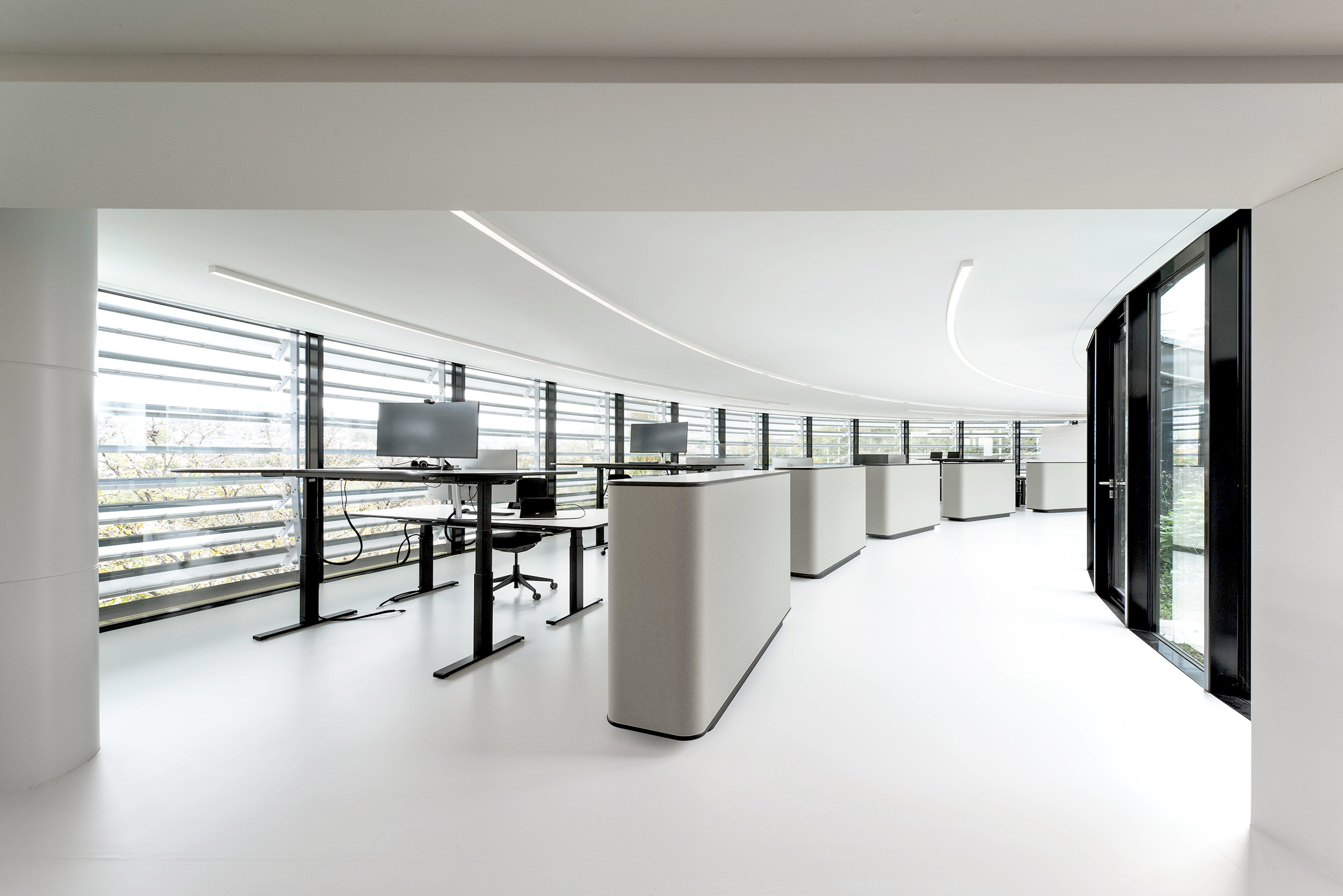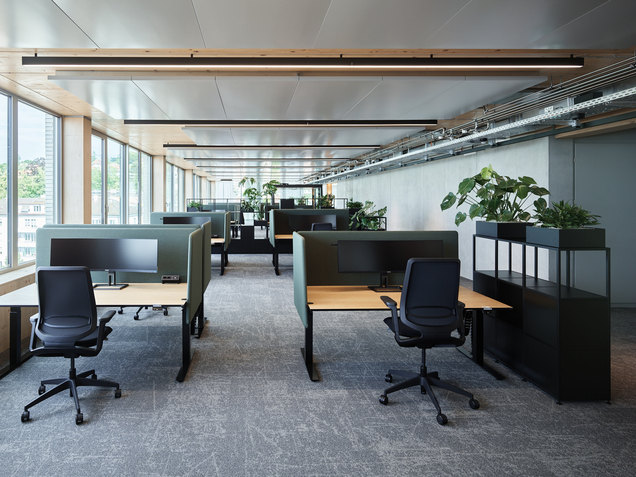 Le moderne architetture di uffici tendono sempre più spesso verso grandi ambienti. I confini tra postazioni singole, gruppi di lavoro e sale di riunione sono fluidi. Per una buona riuscita dell’utilizzo flessibile, senza sacrificare né la concentrazione né la comunicazione, è necessario un sistema illuminotecnico diversificato, tale da strutturare le zone e distinguerle visivamente: una possibilità è combinare nel modo giusto la luce diretta e quella indiretta. Le plafoniere e gli apparecchi a sospensione assicurano la luminosità di sfondo, mentre con i downlights o con faretti orientabili si creano accenti e suddivisioni ottiche. Le persone che lavorano dovrebbero avere anche la possibilità di adattare individualmente il livello di luce con piantane o apparecchi da tavolo.