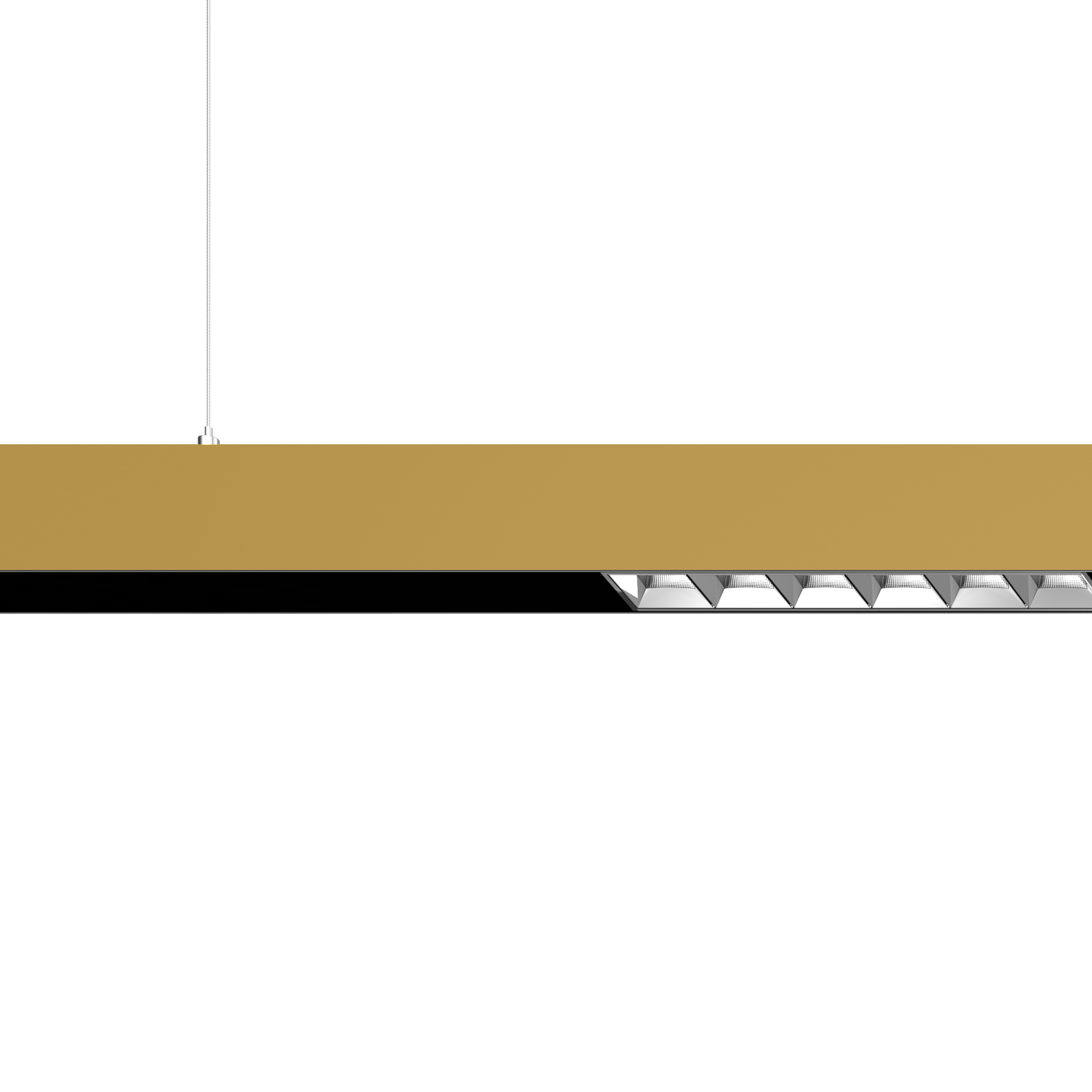Profilo di alluminio estruso con fuga larga 45mm; per installazioni a plafone da parete / da soffitto o per installazioni sospese (fune di 1500mm come accessorio); regolazione altezza senza utensili; con binario elettrificato integrato per la riduzione della tensione di alimentazione e segnale DALI; superficie verniciata a polveri polvere d'oro; Colore interno anodizzata nero; inserti luce con installazione e posizionamento tramite supporto+attacco magnetico senza bisogno di attrezzi; grado protezione IP20; classe isolamento 3; 48 V; accessorio indicato a parte;