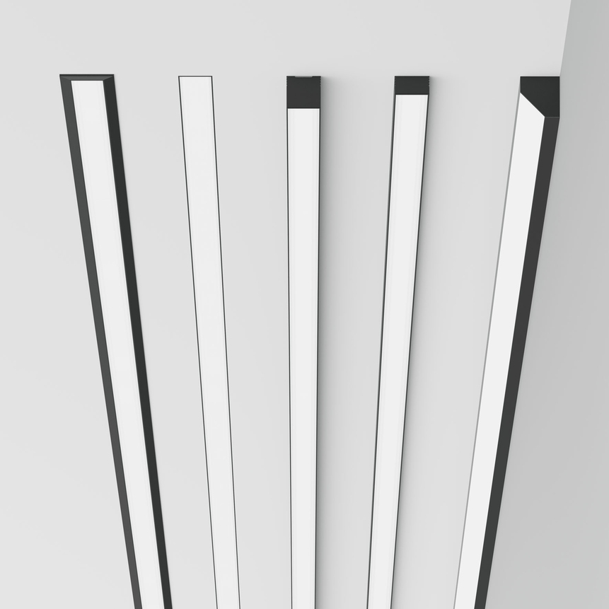 High quality extruded aluminium channel, angular design; surface anodised or powder coated; available in 3 different light colours; flexible use in recessed or surface mounting; in combination with 3 different covers and compatible with 3 different LED or 2 COB strips