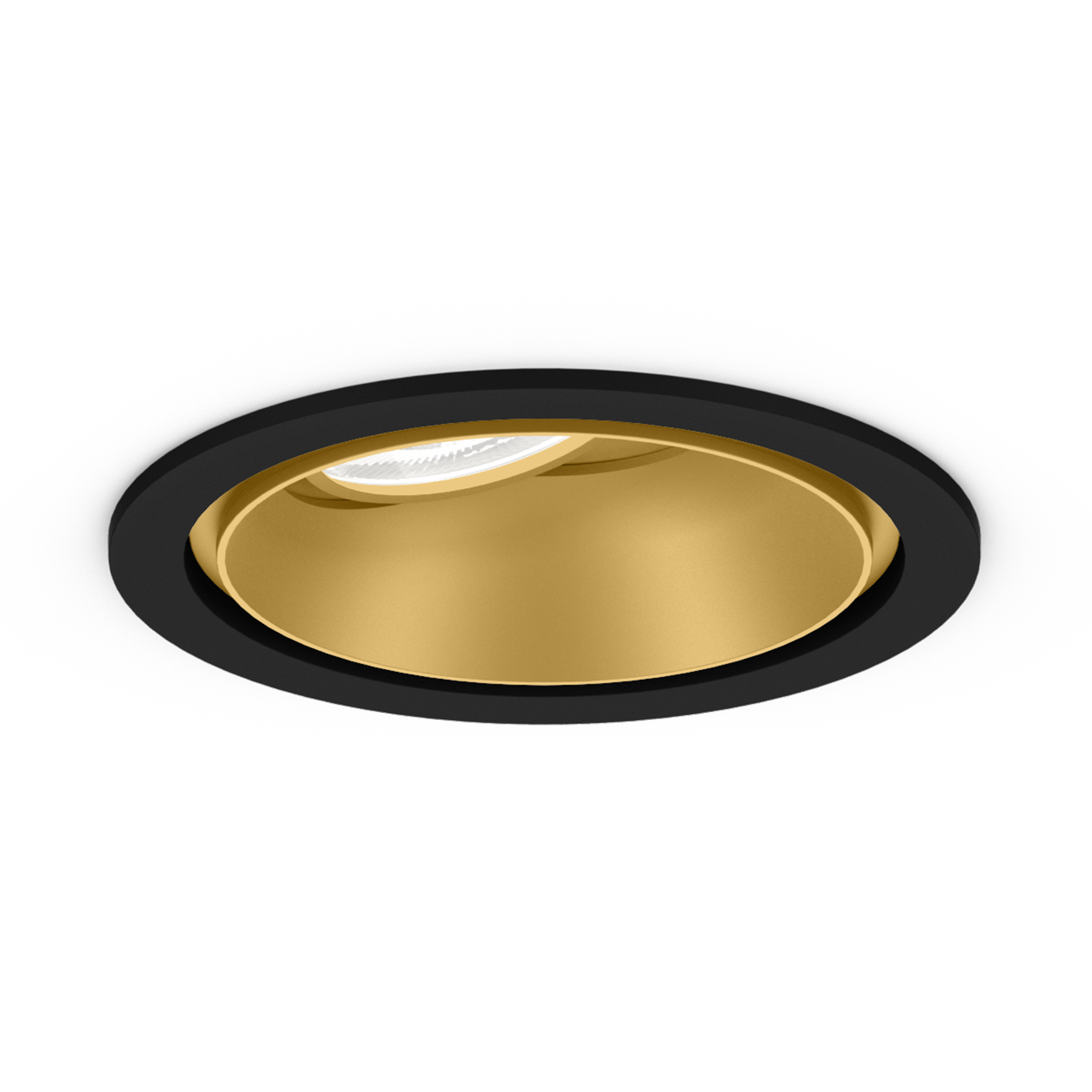 Faretto a incasso rotondo in alluminio pressofuso; a 1 luce; superficie dorato; girevole 360° e orientabile 30°; montaggio senza attrezzi con sistema brevettato a moschettone sferico; cassaforma rotondo; con bordo perimetrale nero intenso; adatto per soffitti con spessore di 2-25 mm; raffreddamento passivo del LED grazie alla geometria ottimizzata del dissipadore; con tecnologia COB (Chip on Board) per la massima efficienza; assenza di ombre multiple; colore della luce 4000 K; binning iniziale MacAdam ≤ 2 SDCM; CRI ≥ 90; 80 % min. del flusso luminoso dopo 50000 ore di esercizio; LED a efficienza energetica con un'elevata resa cromatica; incl. ottica a lente di alta qualità; emissione precisa con angolo di emissione di 32°; UGR ≤ 16; luce da lavoro adatta a schermi conform. DIN EN 12464-1; luminanza superiore a 65° ≤ 3000 cd/m²; classe di protezione IP40 in basso (IP20 in alto); classe isolamento 2 220-240V; incl. convertitore, non dimmerabile; scatola di allacciamento per cablaggio passante, tripolare o pentapolare, disponibile come accessorio; accessorio indicato a parte; sorgente luminosa sostituibile da tecnici specializzati autorizzati; dispositivo di controllo sostituibile da tecnici specializzati autorizzati;
