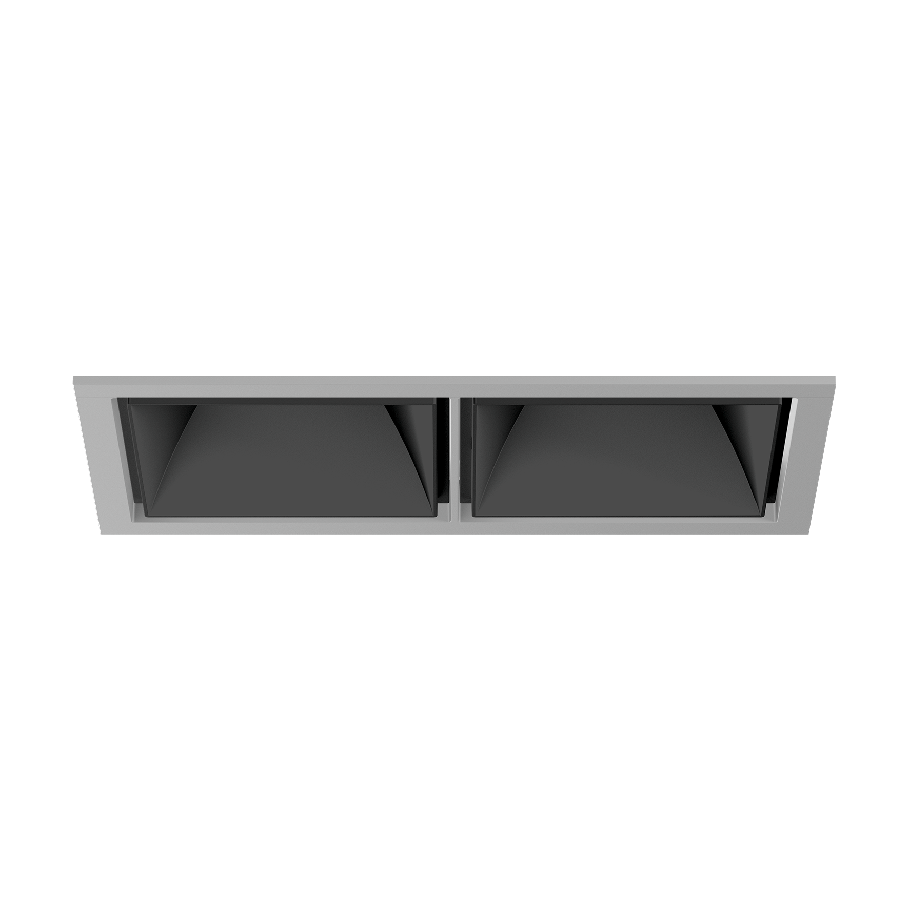 Faro da incasso quadrato in alluminio pressofuso; a 2 luci; superficie nero; montaggio senza attrezzi con sistema brevettato a moschettone sferico; cassaforma rettangolare; con bordo perimetrale alluminio bianco; adatto per soffitti con spessore di 2-25 mm; raffreddamento passivo del LED grazie alla geometria ottimizzata del dissipadore; con tecnologia COB (Chip on Board) per la massima efficienza; assenza di ombre multiple; colore della luce 2700 K; binning iniziale MacAdam ≤ 2 SDCM; CRI ≥ 90; 80 % min. del flusso luminoso dopo 50000 ore di esercizio; LED a efficienza energetica con un'elevata resa cromatica; incl. ottica a lente di alta qualità; emissione precisa con angolo di emissione di 33°x34°; UGR ≤ 16; luce da lavoro adatta a schermi conform. DIN EN 12464-1; luminanza superiore a 65° ≤ 1500 cd/m²; classe di protezione IP44 in basso (IP20 in alto); classe isolamento 2 220-240V; incl. convertitore DALI-2; scatola di allacciamento per cablaggio passante, tripolare o pentapolare, disponibile come accessorio; accessorio indicato a parte; sorgente luminosa sostituibile da tecnici specializzati autorizzati; dispositivo di controllo sostituibile da tecnici specializzati autorizzati;