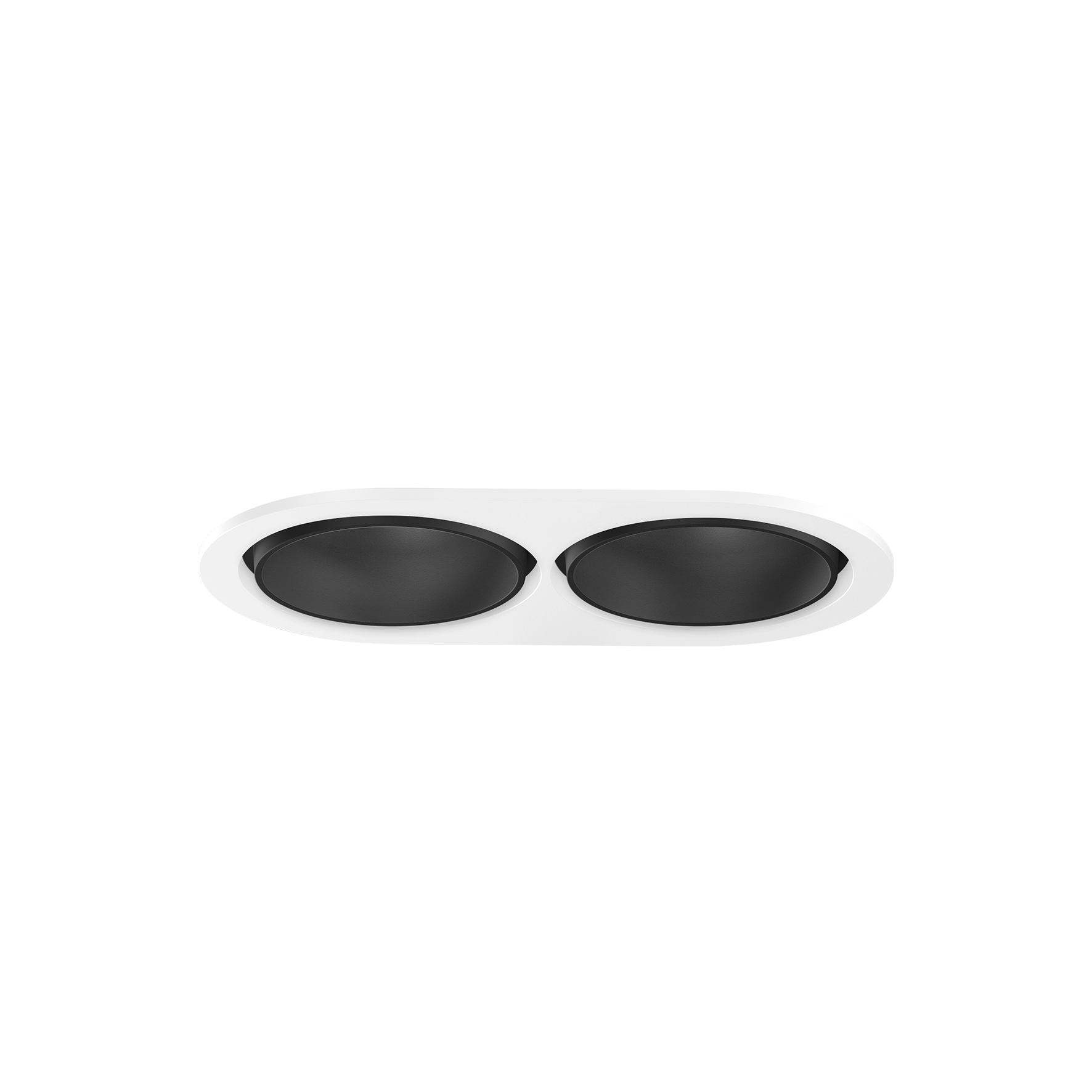 Faretto a incasso rotondo in alluminio pressofuso; a 2 luci; superficie nero; girevole 360° e orientabile 30°; montaggio senza attrezzi con sistema brevettato a moschettone sferico; alloggiamento ovale da incasso; con bordo perimetrale bianco traffico; adatto per soffitti con spessore di 2-25 mm; raffreddamento passivo del LED grazie alla geometria ottimizzata del dissipadore; con tecnologia COB (Chip on Board) per la massima efficienza; assenza di ombre multiple; colore della luce 3000 K; binning iniziale MacAdam ≤ 2 SDCM; CRI ≥ 90; 80 % min. del flusso luminoso dopo 50000 ore di esercizio; LED a efficienza energetica con un'elevata resa cromatica; incl. ottica a lente di alta qualità; emissione precisa con angolo di emissione di 39°; UGR ≤ 16; luce da lavoro adatta a schermi conform. DIN EN 12464-1; luminanza superiore a 65° ≤ 3000 cd/m²; classe di protezione IP40 in basso (IP20 in alto); classe isolamento 2 220-240V; incl. convertitore DALI-2; sorgente luminosa sostituibile da tecnici specializzati autorizzati; dispositivo di controllo sostituibile da tecnici specializzati autorizzati;