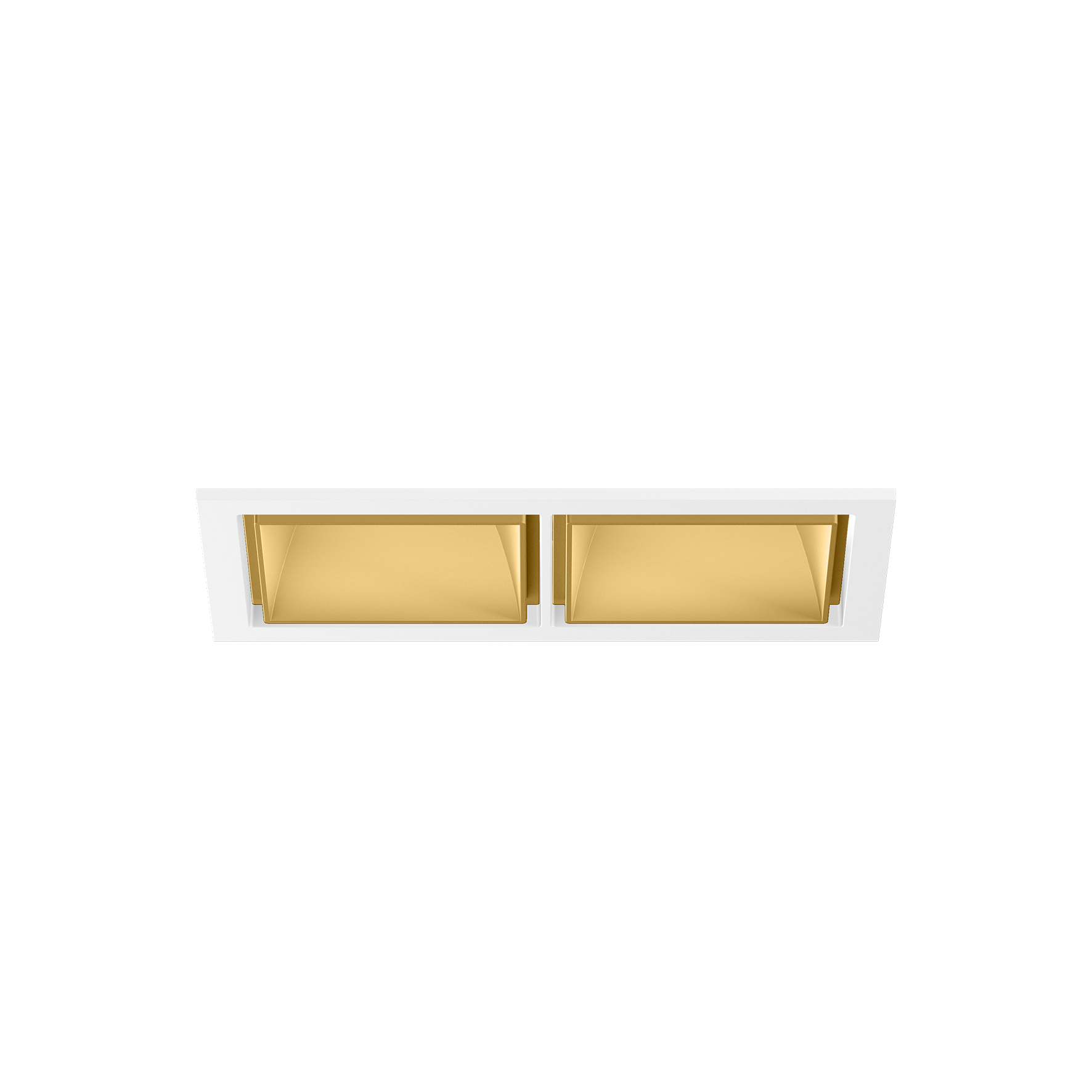 Faro da incasso quadrato in alluminio pressofuso; a 2 luci; superficie dorato; montaggio senza attrezzi con sistema brevettato a moschettone sferico; cassaforma rettangolare; con bordo perimetrale bianco traffico; adatto per soffitti con spessore di 2-25 mm; raffreddamento passivo del LED grazie alla geometria ottimizzata del dissipadore; con tecnologia COB (Chip on Board) per la massima efficienza; assenza di ombre multiple; colore della luce 3000 K; binning iniziale MacAdam ≤ 2 SDCM; CRI ≥ 90; 80 % min. del flusso luminoso dopo 50000 ore di esercizio; LED a efficienza energetica con un'elevata resa cromatica; incl. ottica a lente di alta qualità; emissione precisa con angolo di emissione di 41°; UGR ≤ 16; luce da lavoro adatta a schermi conform. DIN EN 12464-1; luminanza superiore a 65° ≤ 1500 cd/m²; classe di protezione IP44 in basso (IP20 in alto); classe isolamento 2; 220-240 V; incl. convertitore DALI-2; scatola di allacciamento per cablaggio passante, tripolare o pentapolare, disponibile come accessorio; accessorio indicato a parte; sorgente luminosa sostituibile da tecnici specializzati autorizzati; dispositivo di controllo sostituibile da tecnici specializzati autorizzati;