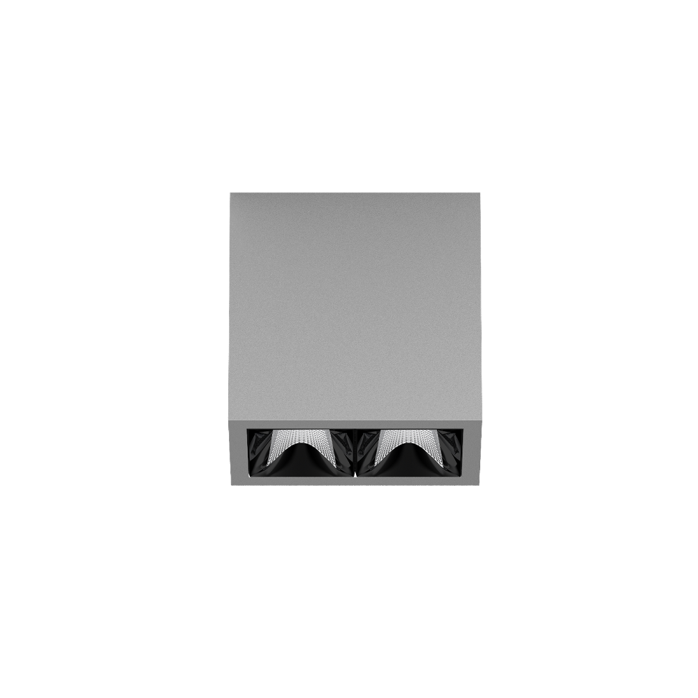 Downlight multiplo rettangolare in alluminio con montaggio a superficie; corpo illuminante montabile ad appoggio senza attrezzi su piastra di montaggio tramite blocco di sicurezza; convertitore integrato nel corpo illuminante; superficie verniciata a polveri alluminio bianco; dotato di due ottiche wide flood round; distribuzione simmetrica della luce con precise caratteristiche di emissione, angolo di emissione di 72°; riflettore di alta qualità con superficie sfaccettata in alluminio vaporizzato; Riflettore nero; raffreddamento passivo del LED grazie alla geometria ottimizzata del dissipadore; colore della luce 4000 K; ≤ 3 SDCM (initial MacAdam); CRI ≥ 90; 90 % min. del flusso luminoso dopo 50000 h di durata di vita; LED high power a risparmio energetico con ottima resa cromatica; grado protezione IP20; classe isolamento 1; 220-240 V; incl. convertitore, non dimmerabile; sorgente luminosa non sostituibile; dispositivo di controllo sostituibile da tecnici specializzati autorizzati; senza distorsione;