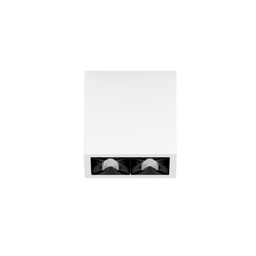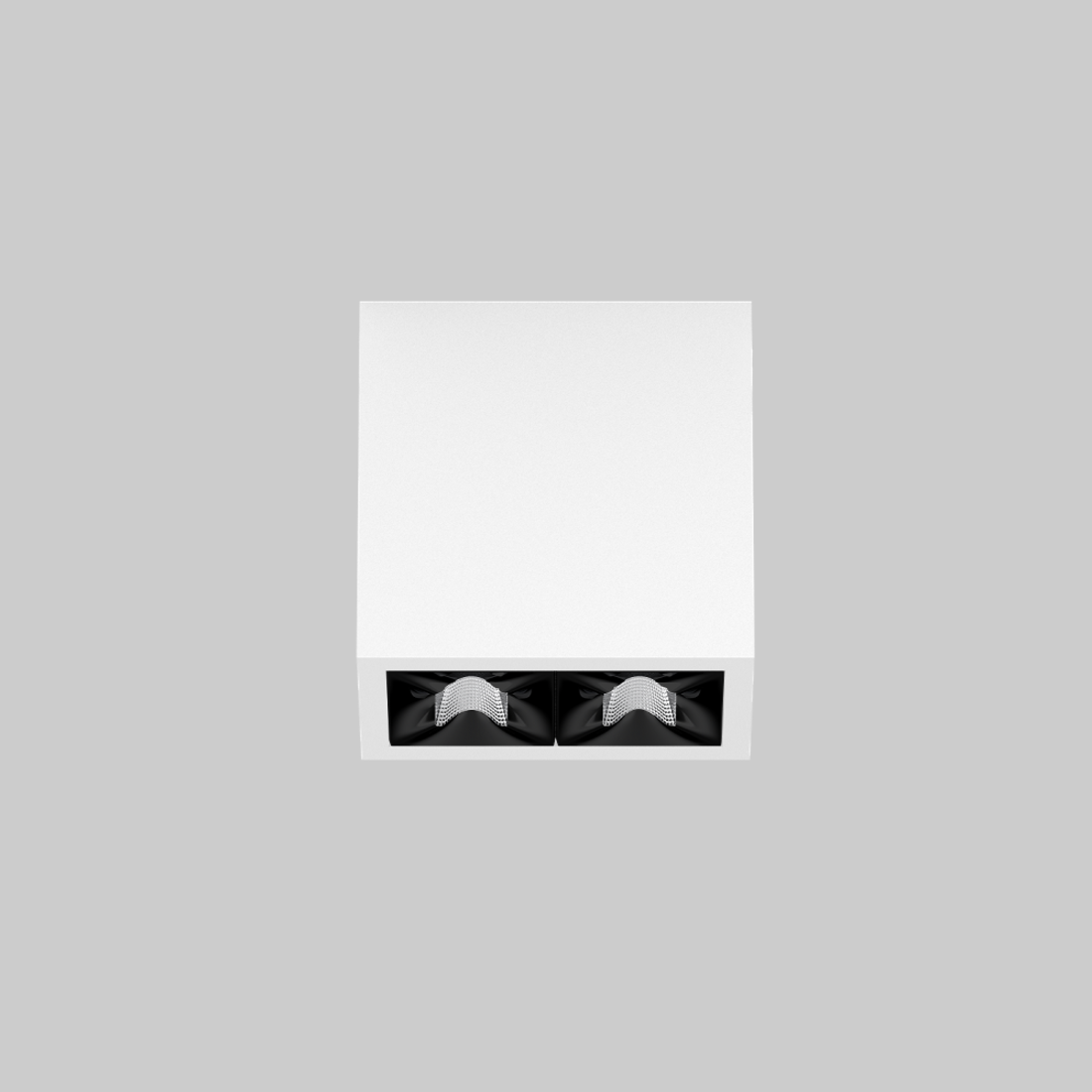 Downlight multiplo rettangolare in alluminio con montaggio a superficie; corpo illuminante montabile ad appoggio senza attrezzi su piastra di montaggio tramite blocco di sicurezza; convertitore integrato nel corpo illuminante; superficie verniciata a polveri bianco traffico; dotato di due ottiche medium round; distribuzione simmetrica della luce con precise caratteristiche di emissione, angolo di emissione di 33°; riflettore di alta qualità con superficie sfaccettata in alluminio vaporizzato; Riflettore nero; UGR ≤ 10; raffreddamento passivo del LED grazie alla geometria ottimizzata del dissipadore; colore della luce 3000 K; ≤ 3 SDCM (initial MacAdam); CRI ≥ 90; 90 % min. del flusso luminoso dopo 50000 h di durata di vita; LED high power a risparmio energetico con ottima resa cromatica; grado protezione IP20; classe isolamento 1; 220-240 V; incl. convertitore, non dimmerabile; sorgente luminosa non sostituibile; dispositivo di controllo sostituibile da tecnici specializzati autorizzati; senza distorsione;