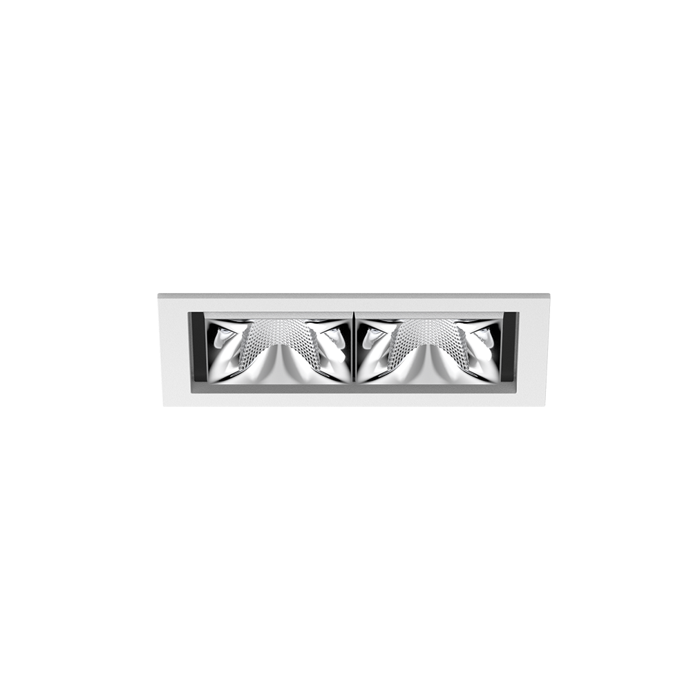 Downlight multiplo rettangolare da incasso in alluminio pressofuso; montaggio senza attrezzi con sistema brevettato a moschettone sferico; cassaforma rettangolare; con bordo perimetrale bianco traffico; adatto per soffitti con spessore di 2-25 mm; dotato di due ottiche flood round; distribuzione simmetrica della luce con precise caratteristiche di emissione, angolo di emissione di 49°; riflettore di alta qualità con superficie sfaccettata in alluminio vaporizzato; riflettore cromato; UGR ≤ 16; luce da lavoro adatta a schermi conform. DIN EN 12464-1; luminanza superiore a 65° ≤ 3000 cd/m²; raffreddamento passivo del LED grazie alla geometria ottimizzata del dissipadore; colore della luce 2700 K; ≤ 3 SDCM (initial MacAdam); CRI ≥ 90; 90 % min. del flusso luminoso dopo 50000 h di durata di vita; LED high power a risparmio energetico con ottima resa cromatica; grado protezione IP20; classe isolamento 2; 220-240 V; incl. convertitore, non dimmerabile; scatola di allacciamento per cablaggio passante, tripolare o pentapolare, disponibile come accessorio; accessorio indicato a parte; sorgente luminosa non sostituibile; dispositivo di controllo sostituibile da tecnici specializzati autorizzati; senza distorsione;
