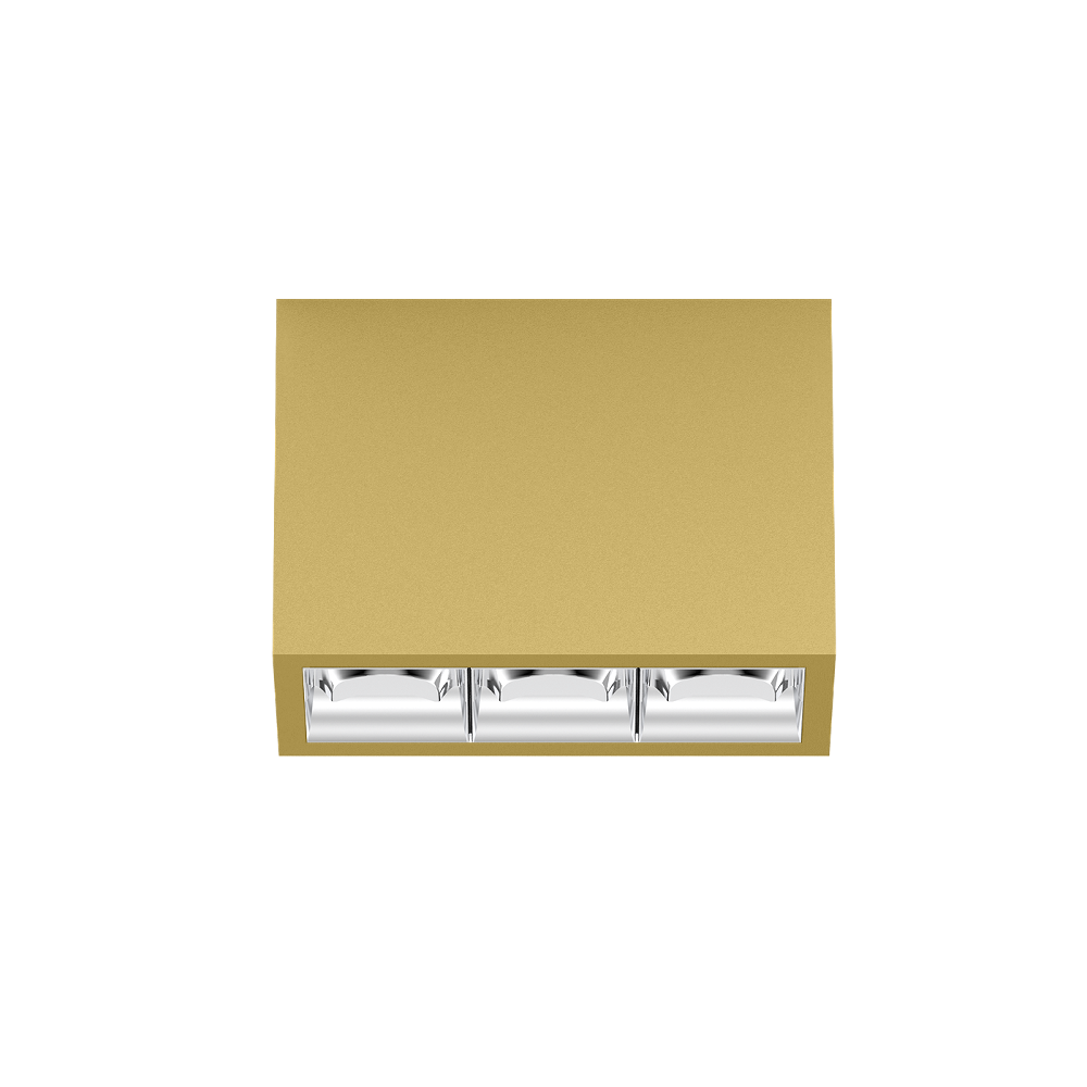 Downlight multiplo rettangolare in alluminio con montaggio a superficie; corpo illuminante montabile ad appoggio senza attrezzi su piastra di montaggio tramite blocco di sicurezza; convertitore integrato nel corpo illuminante; superficie verniciata a polveri polvere d'oro; dotato di tre ottiche wallwasher; distribuzione asimmetrica della luce con precise caratteristiche di emissione; riflettore di alta qualità con superficie sfaccettata in alluminio vaporizzato; Riflettore cromato; raffreddamento passivo del LED grazie alla geometria ottimizzata del dissipadore; colore della luce 3000 K; ≤ 3 SDCM (initial MacAdam); CRI ≥ 90; 90 % min. del flusso luminoso dopo 50000 h di durata di vita; LED high power a risparmio energetico con ottima resa cromatica; grado protezione IP20; classe isolamento 1; 220-240 V; incl. convertitore DALI-2; sorgente luminosa non sostituibile; dispositivo di controllo sostituibile da tecnici specializzati autorizzati; senza distorsione;