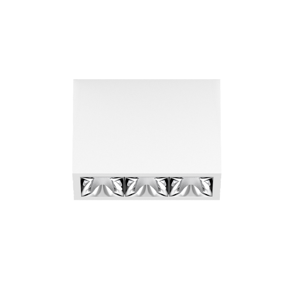 Downlight multiplo rettangolare in alluminio con montaggio a superficie; corpo illuminante montabile ad appoggio senza attrezzi su piastra di montaggio tramite blocco di sicurezza; convertitore integrato nel corpo illuminante; superficie verniciata a polveri bianco traffico; dotato di tre ottiche flood round; distribuzione simmetrica della luce con precise caratteristiche di emissione, angolo di emissione di 49°; riflettore di alta qualità con superficie sfaccettata in alluminio vaporizzato; Riflettore cromato; UGR ≤ 19; raffreddamento passivo del LED grazie alla geometria ottimizzata del dissipadore; colore della luce 2700 K; binning iniziale MacAdam ≤ 3 SDCM; CRI ≥ 90; 90 % min. del flusso luminoso dopo 50000 h di durata di vita; LED high power a risparmio energetico con ottima resa cromatica; grado protezione IP20; classe isolamento 1; 220-240 V; incl. convertitore DALI-2; sorgente luminosa non sostituibile; dispositivo di controllo sostituibile da tecnici specializzati autorizzati; senza distorsione;