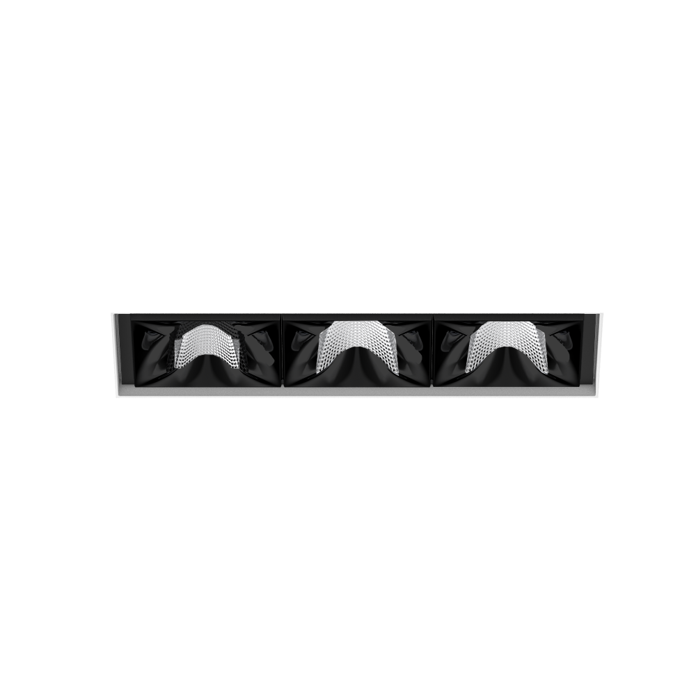 Downlight multiplo rettangolare da incasso in alluminio pressofuso; montaggio senza attrezzi con sistema brevettato a moschettone sferico; cassaforma rettangolare; per incasso a scomparsa in soffitti di cartongesso; per soffitti spessore di 12,5/15/20/25 mm; dotato di tre ottiche flood round; distribuzione simmetrica della luce con precise caratteristiche di emissione, angolo di emissione di 49°; riflettore di alta qualità con superficie sfaccettata in alluminio vaporizzato; riflettore nero; UGR ≤ 16; luce da lavoro adatta a schermi conform. DIN EN 12464-1; luminanza superiore a 65° ≤ 3000 cd/m²; raffreddamento passivo del LED grazie alla geometria ottimizzata del dissipadore; colore della luce 3000 K; binning iniziale MacAdam ≤ 3 SDCM; CRI ≥ 90; 90 % min. del flusso luminoso dopo 50000 h di durata di vita; LED high power a risparmio energetico con ottima resa cromatica; grado protezione IP20; classe isolamento 2; 220-240 V; incl. convertitore DALI-2; scatola di allacciamento per cablaggio passante, tripolare o pentapolare, disponibile come accessorio; accessorio indicato a parte; sorgente luminosa non sostituibile; dispositivo di controllo sostituibile da tecnici specializzati autorizzati; senza distorsione;