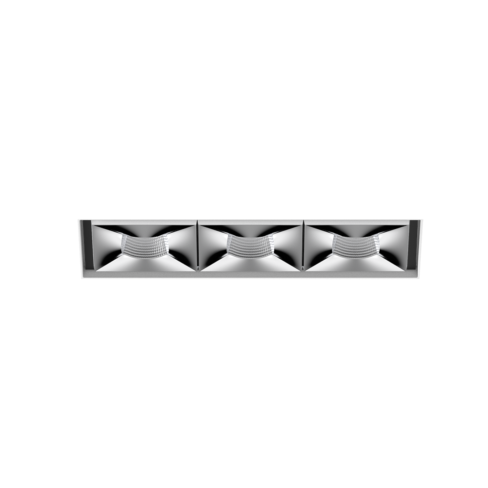 Downlight multiplo rettangolare da incasso in alluminio pressofuso; montaggio senza attrezzi con sistema brevettato a moschettone sferico; cassaforma rettangolare; per incasso a scomparsa in soffitti di cartongesso; per soffitti spessore di 12,5/15/20/25 mm; dotato di tre ottiche medium square; distribuzione simmetrica della luce con precise caratteristiche di emissione, angolo di emissione di 32°; riflettore di alta qualità con superficie sfaccettata in alluminio vaporizzato; riflettore cromato; UGR ≤ 10; luce da lavoro adatta a schermi conform. DIN EN 12464-1; luminanza superiore a 65° ≤ 3000 cd/m²; raffreddamento passivo del LED grazie alla geometria ottimizzata del dissipadore; colore della luce 4000 K; ≤ 3 SDCM (initial MacAdam); CRI ≥ 90; 90 % min. del flusso luminoso dopo 50000 h di durata di vita; LED high power a risparmio energetico con ottima resa cromatica; grado protezione IP20; classe isolamento 2; 220-240 V; incl. convertitore DALI-2; scatola di allacciamento per cablaggio passante, tripolare o pentapolare, disponibile come accessorio; accessorio indicato a parte; sorgente luminosa non sostituibile; dispositivo di controllo sostituibile da tecnici specializzati autorizzati; senza distorsione;