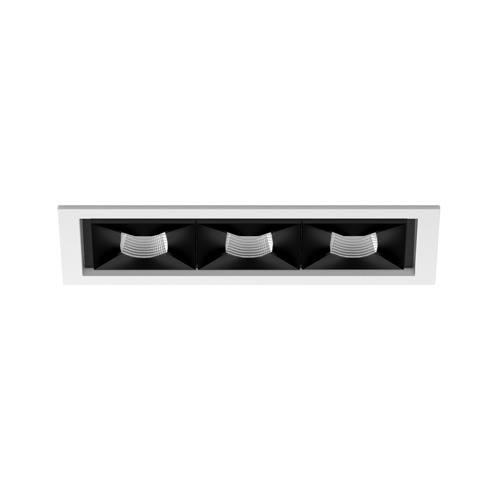 Downlight multiplo rettangolare da incasso in alluminio pressofuso; montaggio senza attrezzi con sistema brevettato a moschettone sferico; cassaforma rettangolare; con bordo perimetrale bianco traffico; adatto per soffitti con spessore di 2-25 mm; dotato di tre ottiche medium square; distribuzione simmetrica della luce con precise caratteristiche di emissione, angolo di emissione di 32°; riflettore di alta qualità con superficie sfaccettata in alluminio vaporizzato; riflettore nero; UGR ≤ 10; luce da lavoro adatta a schermi conform. DIN EN 12464-1; luminanza superiore a 65° ≤ 3000 cd/m²; raffreddamento passivo del LED grazie alla geometria ottimizzata del dissipadore; colore della luce 4000 K; ≤ 3 SDCM (initial MacAdam); CRI ≥ 90; 90 % min. del flusso luminoso dopo 50000 h di durata di vita; LED high power a risparmio energetico con ottima resa cromatica; grado protezione IP20; classe isolamento 2; 220-240 V; incl. convertitore, non dimmerabile; scatola di allacciamento per cablaggio passante, tripolare o pentapolare, disponibile come accessorio; accessorio indicato a parte; sorgente luminosa non sostituibile; dispositivo di controllo sostituibile da tecnici specializzati autorizzati; senza distorsione;