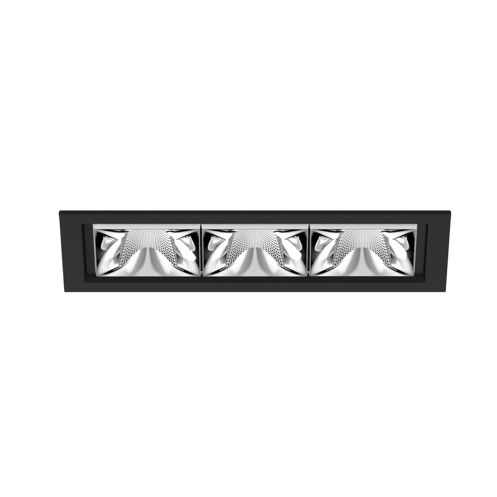 Downlight multiplo rettangolare da incasso in alluminio pressofuso; montaggio senza attrezzi con sistema brevettato a moschettone sferico; cassaforma rettangolare; con bordo perimetrale nero intenso; adatto per soffitti con spessore di 2-25 mm; dotato di tre ottiche flood round; distribuzione simmetrica della luce con precise caratteristiche di emissione, angolo di emissione di 49°; riflettore di alta qualità con superficie sfaccettata in alluminio vaporizzato; riflettore cromato; UGR ≤ 16; luce da lavoro adatta a schermi conform. DIN EN 12464-1; luminanza superiore a 65° ≤ 3000 cd/m²; raffreddamento passivo del LED grazie alla geometria ottimizzata del dissipadore; colore della luce 4000 K; ≤ 3 SDCM (initial MacAdam); CRI ≥ 90; 90 % min. del flusso luminoso dopo 50000 h di durata di vita; LED high power a risparmio energetico con ottima resa cromatica; grado protezione IP20; classe isolamento 2; 220-240 V; incl. convertitore, non dimmerabile; scatola di allacciamento per cablaggio passante, tripolare o pentapolare, disponibile come accessorio; accessorio indicato a parte; sorgente luminosa non sostituibile; dispositivo di controllo sostituibile da tecnici specializzati autorizzati; senza distorsione;
