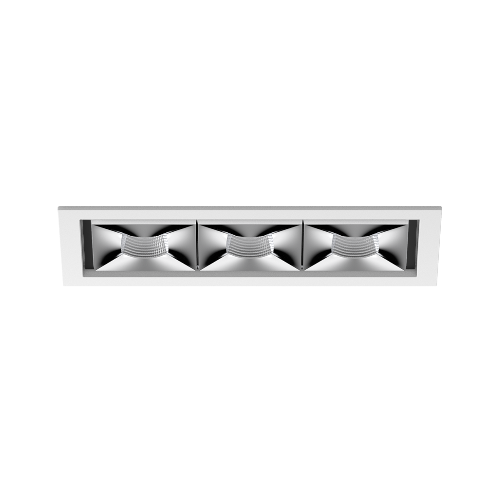 Downlight multiplo rettangolare da incasso in alluminio pressofuso; montaggio senza attrezzi con sistema brevettato a moschettone sferico; cassaforma rettangolare; con bordo perimetrale bianco traffico; adatto per soffitti con spessore di 2-25 mm; dotato di tre ottiche medium square; distribuzione simmetrica della luce con precise caratteristiche di emissione, angolo di emissione di 32°; riflettore di alta qualità con superficie sfaccettata in alluminio vaporizzato; riflettore cromato; UGR ≤ 10; luce da lavoro adatta a schermi conform. DIN EN 12464-1; luminanza superiore a 65° ≤ 3000 cd/m²; raffreddamento passivo del LED grazie alla geometria ottimizzata del dissipadore; colore della luce 4000 K; binning iniziale MacAdam ≤ 3 SDCM; CRI ≥ 90; 90 % min. del flusso luminoso dopo 50000 h di durata di vita; LED high power a risparmio energetico con ottima resa cromatica; grado protezione IP20; classe isolamento 2; 220-240 V; incl. convertitore DALI-2; scatola di allacciamento per cablaggio passante, tripolare o pentapolare, disponibile come accessorio; accessorio indicato a parte; sorgente luminosa non sostituibile; dispositivo di controllo sostituibile da tecnici specializzati autorizzati; senza distorsione;