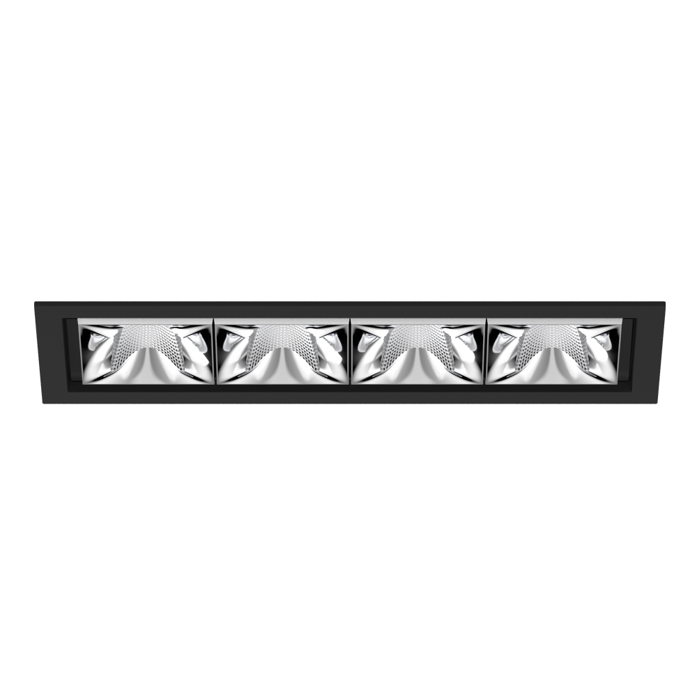 Downlight multiplo rettangolare da incasso in alluminio pressofuso; montaggio senza attrezzi con sistema brevettato a moschettone sferico; cassaforma rettangolare; con bordo perimetrale nero intenso; adatto per soffitti con spessore di 2-25 mm; dotato di quattro ottiche flood round; distribuzione simmetrica della luce con precise caratteristiche di emissione, angolo di emissione di 49°; riflettore di alta qualità con superficie sfaccettata in alluminio vaporizzato; riflettore cromato; UGR ≤ 16; luce da lavoro adatta a schermi conform. DIN EN 12464-1; luminanza superiore a 65° ≤ 3000 cd/m²; raffreddamento passivo del LED grazie alla geometria ottimizzata del dissipadore; colore della luce 4000 K; binning iniziale MacAdam ≤ 3 SDCM; CRI ≥ 90; 90 % min. del flusso luminoso dopo 50000 h di durata di vita; LED high power a risparmio energetico con ottima resa cromatica; grado protezione IP20; classe isolamento 2; 220-240 V; incl. convertitore DALI-2; scatola di allacciamento per cablaggio passante, tripolare o pentapolare, disponibile come accessorio; accessorio indicato a parte; sorgente luminosa non sostituibile; dispositivo di controllo sostituibile da tecnici specializzati autorizzati; senza distorsione;