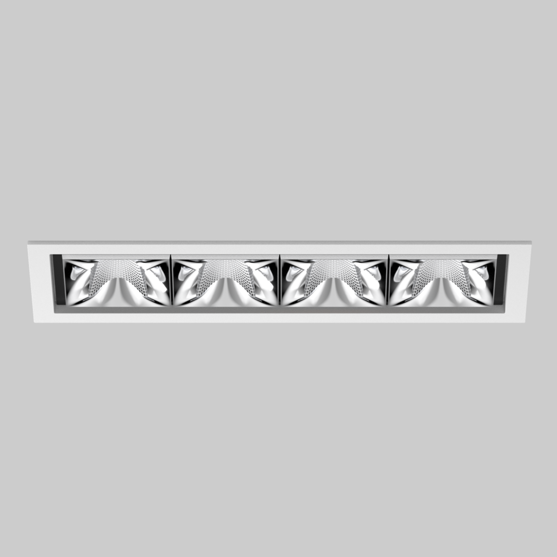 Downlight multiplo rettangolare da incasso in alluminio pressofuso; montaggio senza attrezzi con sistema brevettato a moschettone sferico; cassaforma rettangolare; con bordo perimetrale bianco traffico; adatto per soffitti con spessore di 2-25 mm; dotato di quattro ottiche flood round; distribuzione simmetrica della luce con precise caratteristiche di emissione, angolo di emissione di 49°; riflettore di alta qualità con superficie sfaccettata in alluminio vaporizzato; riflettore cromato; UGR ≤ 16; luce da lavoro adatta a schermi conform. DIN EN 12464-1; luminanza superiore a 65° ≤ 3000 cd/m²; raffreddamento passivo del LED grazie alla geometria ottimizzata del dissipadore; colore della luce 3000 K; ≤ 3 SDCM (initial MacAdam); CRI ≥ 90; 90 % min. del flusso luminoso dopo 50000 h di durata di vita; LED high power a risparmio energetico con ottima resa cromatica; grado protezione IP20; classe isolamento 2; 220-240 V; incl. convertitore DALI-2; scatola di allacciamento per cablaggio passante, tripolare o pentapolare, disponibile come accessorio; accessorio indicato a parte; sorgente luminosa non sostituibile; dispositivo di controllo sostituibile da tecnici specializzati autorizzati; senza distorsione;
