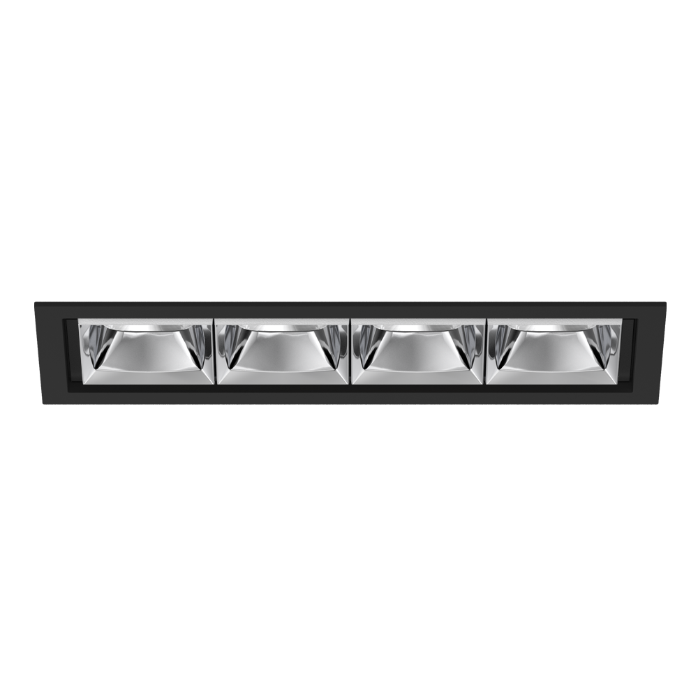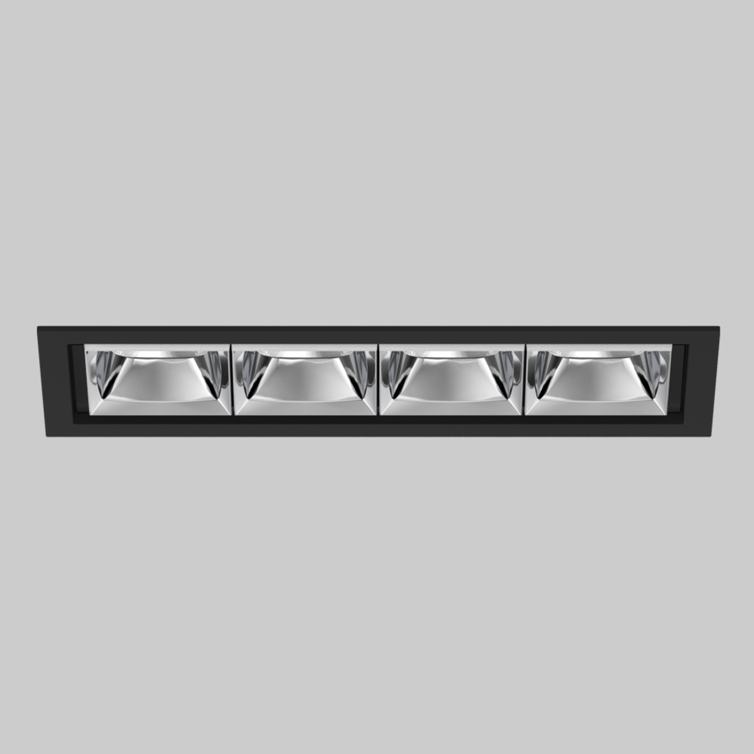 Downlight multiplo rettangolare da incasso in alluminio pressofuso; montaggio senza attrezzi con sistema brevettato a moschettone sferico; cassaforma rettangolare; con bordo perimetrale nero intenso; adatto per soffitti con spessore di 2-25 mm; dotato di quattro ottiche narrow medium round; distribuzione simmetrica della luce con precise caratteristiche di emissione, angolo di emissione di 22°; riflettore di alta qualità con superficie sfaccettata in alluminio vaporizzato; riflettore cromato; raffreddamento passivo del LED grazie alla geometria ottimizzata del dissipadore; colore della luce 3000 K; ≤ 3 SDCM (initial MacAdam); CRI ≥ 90; 90 % min. del flusso luminoso dopo 50000 h di durata di vita; LED high power a risparmio energetico con ottima resa cromatica; grado protezione IP20; classe isolamento 2; 220-240 V; incl. convertitore, non dimmerabile; scatola di allacciamento per cablaggio passante, tripolare o pentapolare, disponibile come accessorio; accessorio indicato a parte; sorgente luminosa non sostituibile; dispositivo di controllo sostituibile da tecnici specializzati autorizzati; senza distorsione;