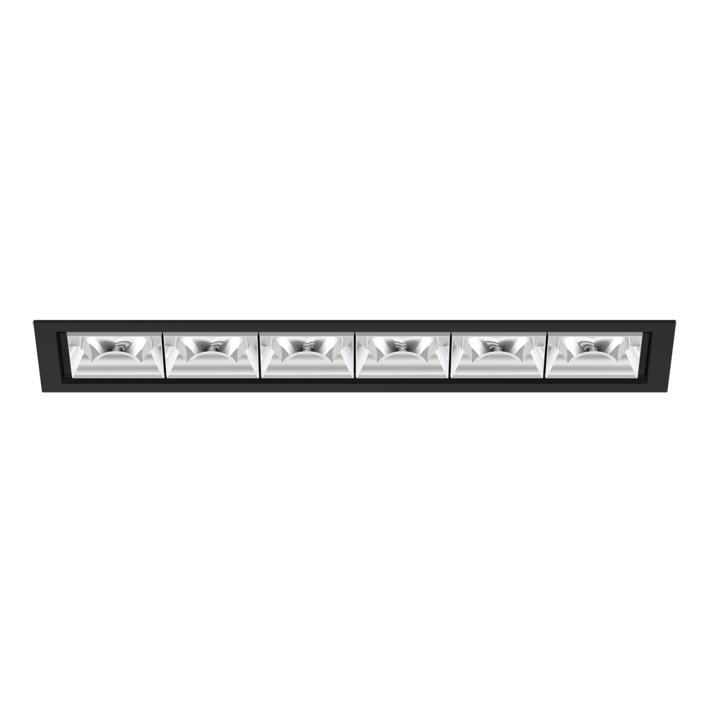 Downlight multiplo rettangolare da incasso in alluminio pressofuso; montaggio senza attrezzi con sistema brevettato a moschettone sferico; cassaforma rettangolare; con bordo perimetrale nero intenso; adatto per soffitti con spessore di 2-25 mm; dotato di sei ottiche wallwasher floor; distribuzione asimmetrica della luce con precise caratteristiche di emissione; riflettore di alta qualità con superficie sfaccettata in alluminio vaporizzato; riflettore cromato; raffreddamento passivo del LED grazie alla geometria ottimizzata del dissipadore; colore della luce 3000 K; ≤ 3 SDCM (initial MacAdam); CRI ≥ 90; 90 % min. del flusso luminoso dopo 50000 h di durata di vita; LED high power a risparmio energetico con ottima resa cromatica; grado protezione IP20; classe isolamento 2; 220-240 V; incl. convertitore DALI-2; scatola di allacciamento per cablaggio passante, tripolare o pentapolare, disponibile come accessorio; accessorio indicato a parte; sorgente luminosa non sostituibile; dispositivo di controllo sostituibile da tecnici specializzati autorizzati; senza distorsione;