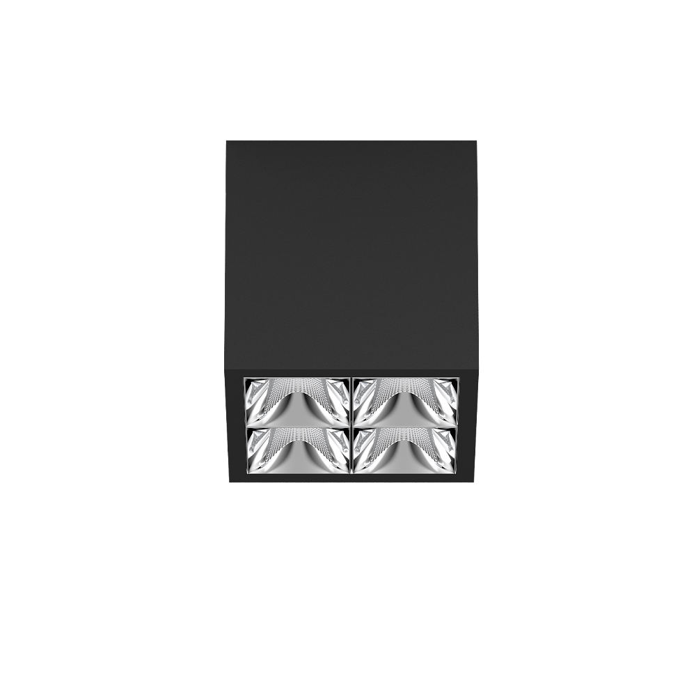 Downlight multiplo quadrato in alluminio con montaggio a superficie; corpo illuminante montabile ad appoggio senza attrezzi su piastra di montaggio tramite blocco di sicurezza; convertitore integrato nel corpo illuminante; superficie verniciata a polveri nero intenso; dotato di quattro ottiche wide flood round; distribuzione simmetrica della luce con precise caratteristiche di emissione, angolo di emissione di 72°; riflettore di alta qualità con superficie sfaccettata in alluminio vaporizzato; Riflettore cromato; raffreddamento passivo del LED grazie alla geometria ottimizzata del dissipadore; colore della luce 2700 K; ≤ 3 SDCM (initial MacAdam); CRI ≥ 90; 90 % min. del flusso luminoso dopo 50000 h di durata di vita; LED high power a risparmio energetico con ottima resa cromatica; grado protezione IP20; classe isolamento 1; 220-240 V; incl. convertitore DALI-2; sorgente luminosa non sostituibile; dispositivo di controllo sostituibile da tecnici specializzati autorizzati; senza distorsione;