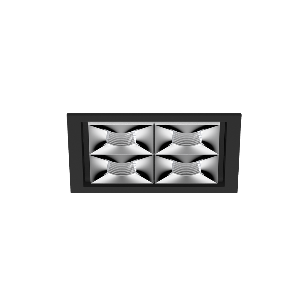 Downlight multiplo quadrato da incasso in alluminio pressofuso; montaggio senza attrezzi con sistema brevettato a moschettone sferico; cassaforma quadrata; con bordo perimetrale nero intenso; adatto per soffitti con spessore di 2-25 mm; dotato di quattro ottiche medium square; distribuzione simmetrica della luce con precise caratteristiche di emissione, angolo di emissione di 32°; riflettore di alta qualità con superficie sfaccettata in alluminio vaporizzato; riflettore cromato; UGR ≤ 10; luce da lavoro adatta a schermi conform. DIN EN 12464-1; luminanza superiore a 65° ≤ 3000 cd/m²; raffreddamento passivo del LED grazie alla geometria ottimizzata del dissipadore; colore della luce 2700 K; binning iniziale MacAdam ≤ 3 SDCM; CRI ≥ 90; 90 % min. del flusso luminoso dopo 50000 h di durata di vita; LED high power a risparmio energetico con ottima resa cromatica; grado protezione IP20; classe isolamento 2; incl. convertitore, non dimmerabile; scatola di allacciamento per cablaggio passante, tripolare o pentapolare, disponibile come accessorio; accessorio indicato a parte; sorgente luminosa non sostituibile; dispositivo di controllo sostituibile da tecnici specializzati autorizzati; senza distorsione;